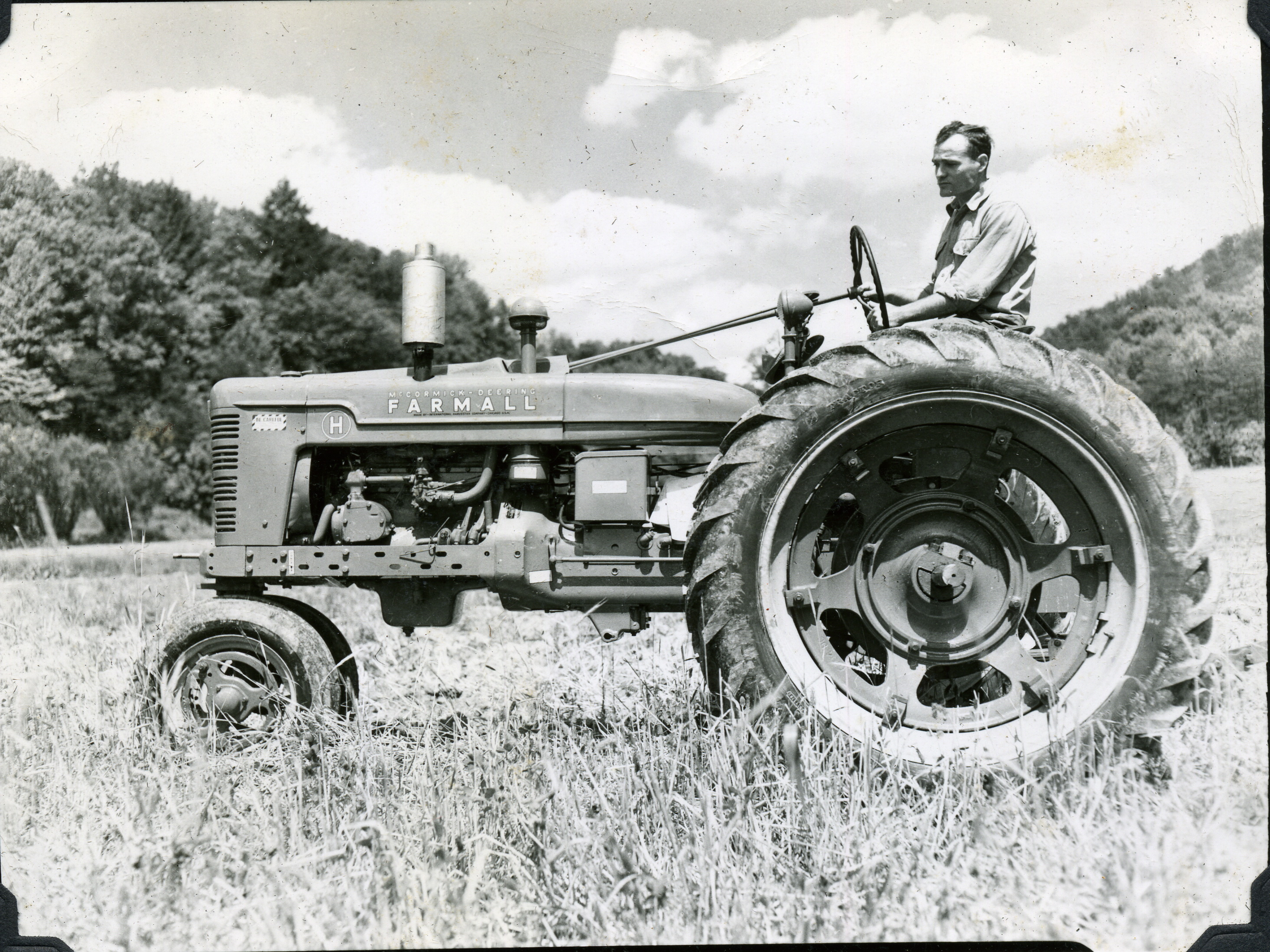 - William Hayes, farmer at PMSS on school Farmall tractor. Grace Rood Album.