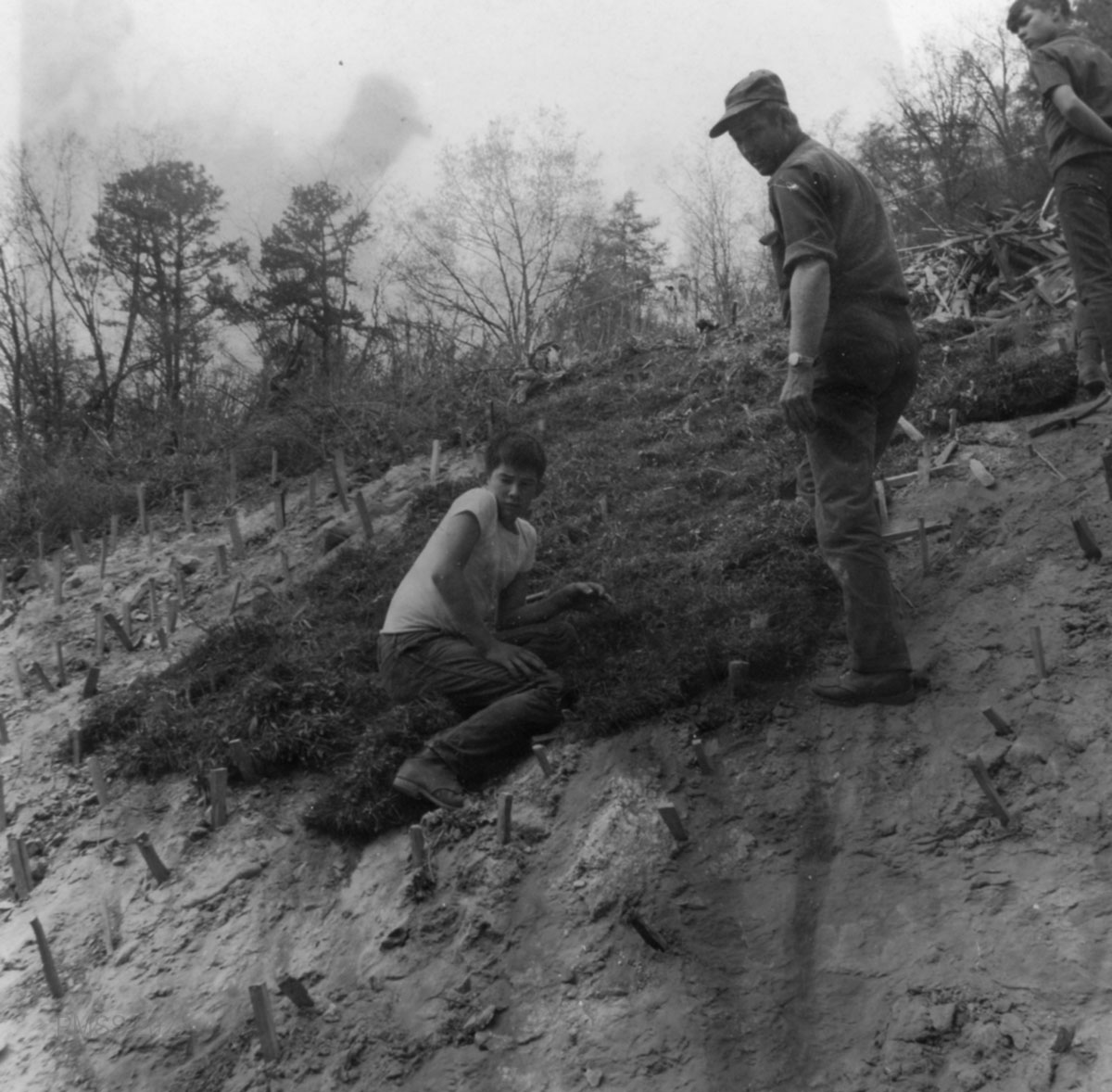005 Planting lespedeza [?] or possibly transplanting daffodils [?] along the fence row. [kramer_loren_earth_day_005]