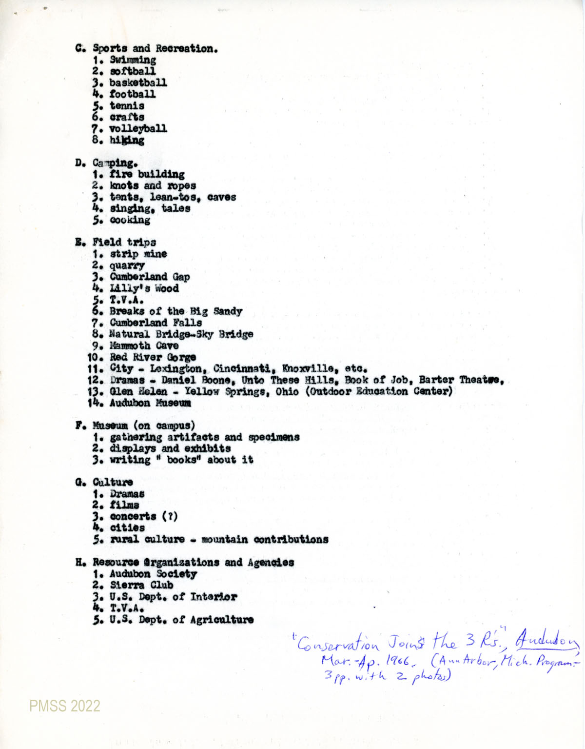 c) provide an educational opportunity for the local community, but also the broader community of neighboring counties and Eastern Kentucky in general.I was first introduced to the formal concept of Outdoor Education when I was in Yellow Springs, Ohio and I became acquainted with the Antioch College program. Antioch’s program is in full force only during the summer months, with its residential and camping program. But, as I thought more about the Pine Mountain situation and especially when I read about the year-round program offered in the Ann Arbor Michigan public school system, (Conservation Joins the 3 R’s, Audubon, March 1966), I realized that my outline should be revised and expanded to accommodate a year-round program for Pine Mountain.