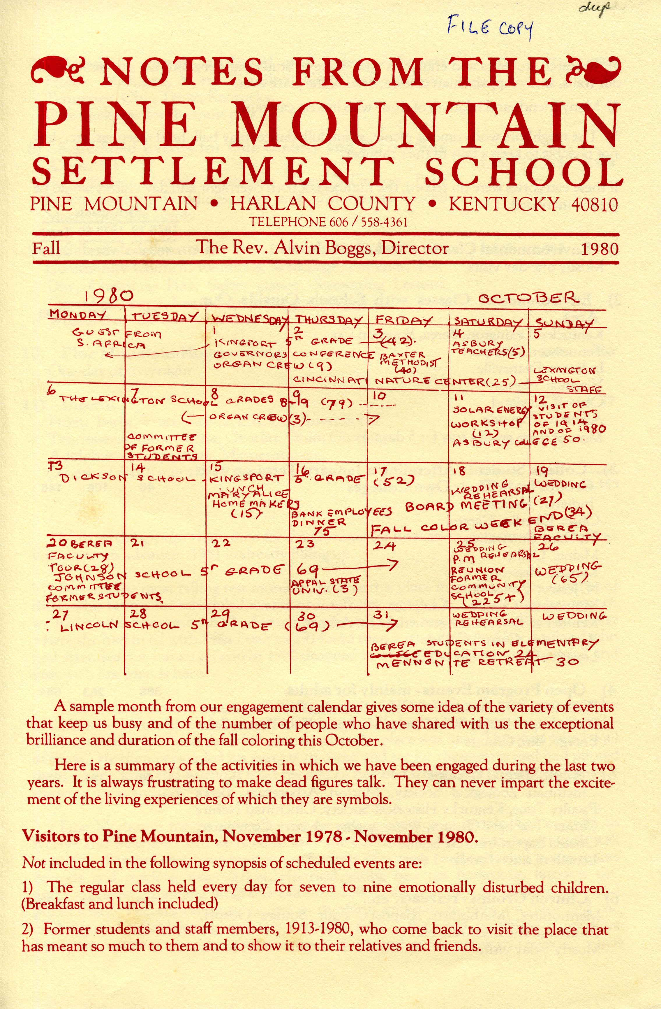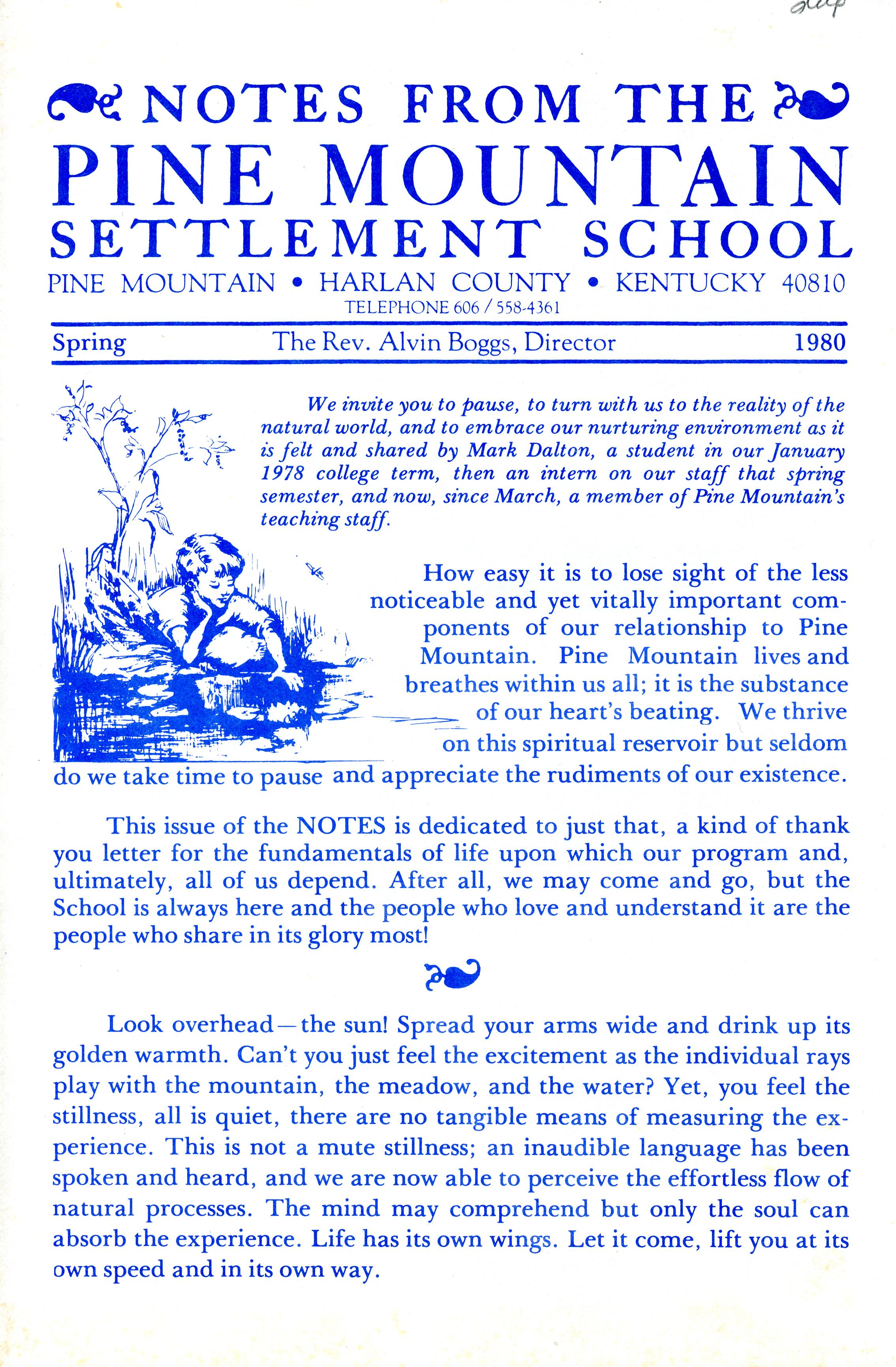 We offer at this time a booklet, “The Pine Mountain Story, 1913-1980” (pp. 31). It “seeks to tell how the school has related to the forces that have been and still are shaping its environment. It describes ways the school has used to adapt its program to meet the area’s changing needs, and…to interpret the motivation that has inspired Pine Mountain’s nearly seventy years of service.”