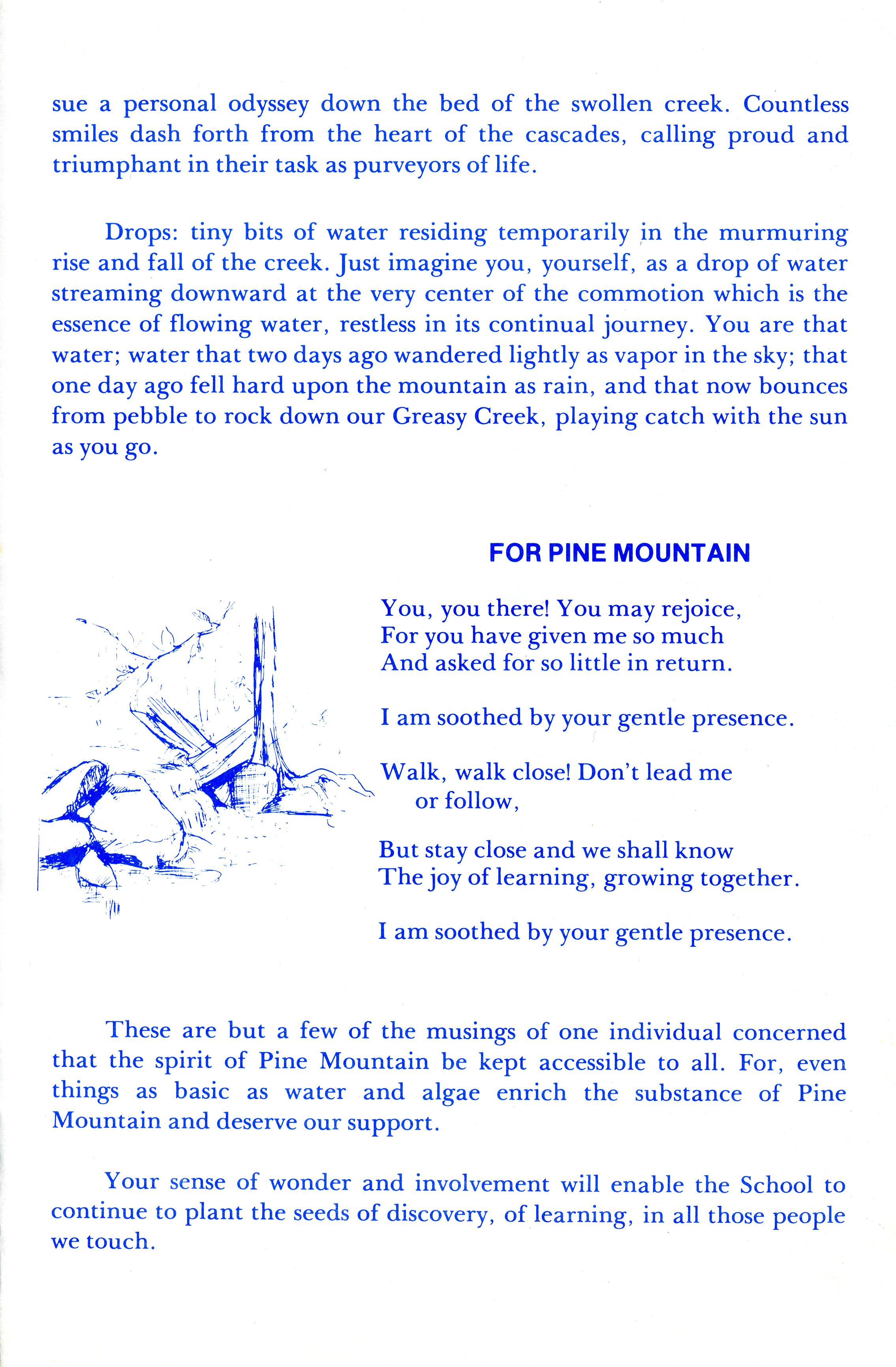 These are but a few of the musings of one individual concerned that the spirit of Pine Mountain be kept accessible to all. For, even things as basic as water and algae enrich the substance of Pine Mountain and deserve our support.