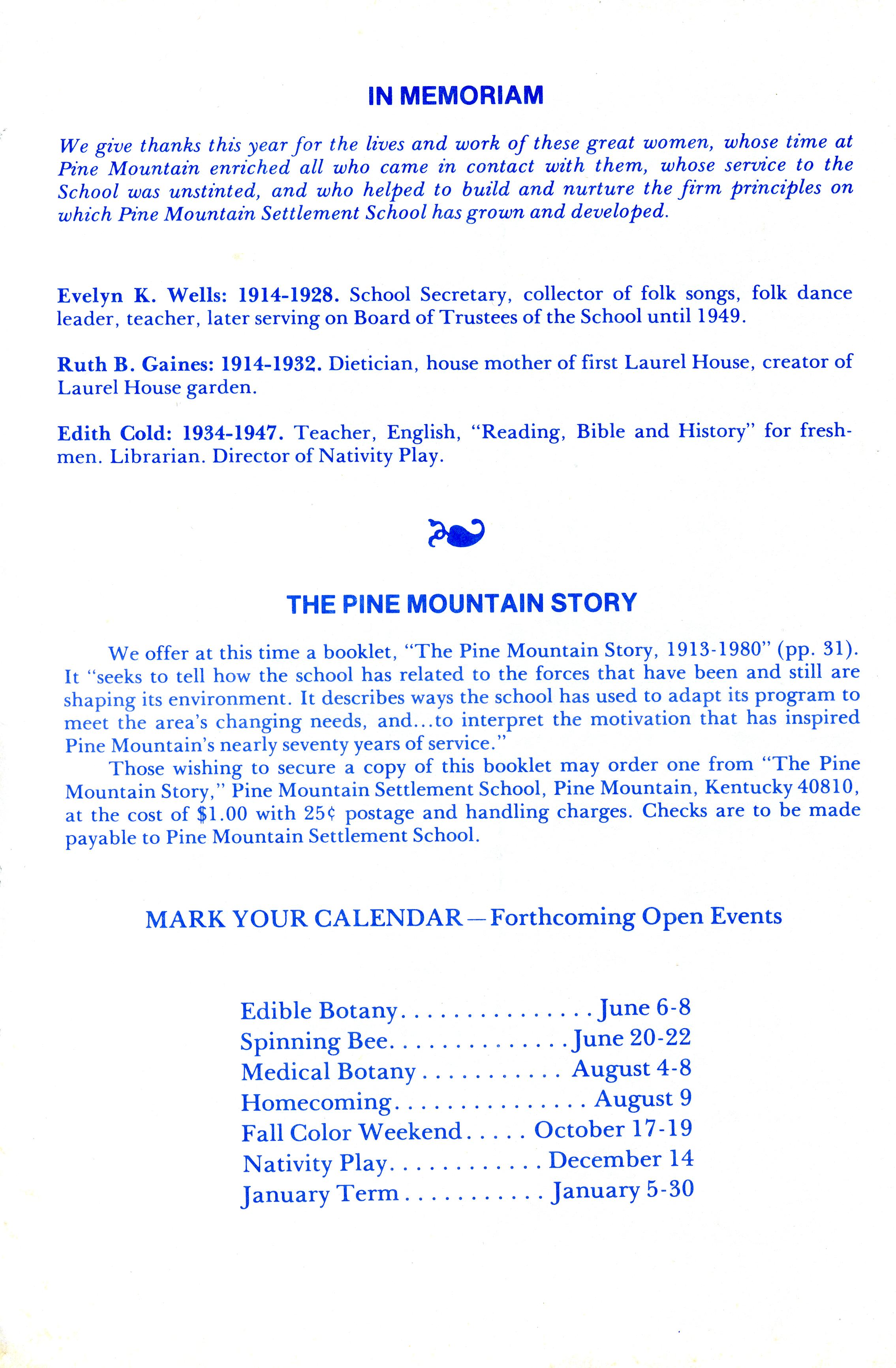Those wishing to secure a copy of this booklet may order one from “The Pine Mountain Story,” Pine Mountain Settlement School, Pine Mountain, Kentucky 40810, at the cost of $1.00 with 25¢ postage and handling charges. Checks are to be made payable to Pine Mountain Settlement School.
