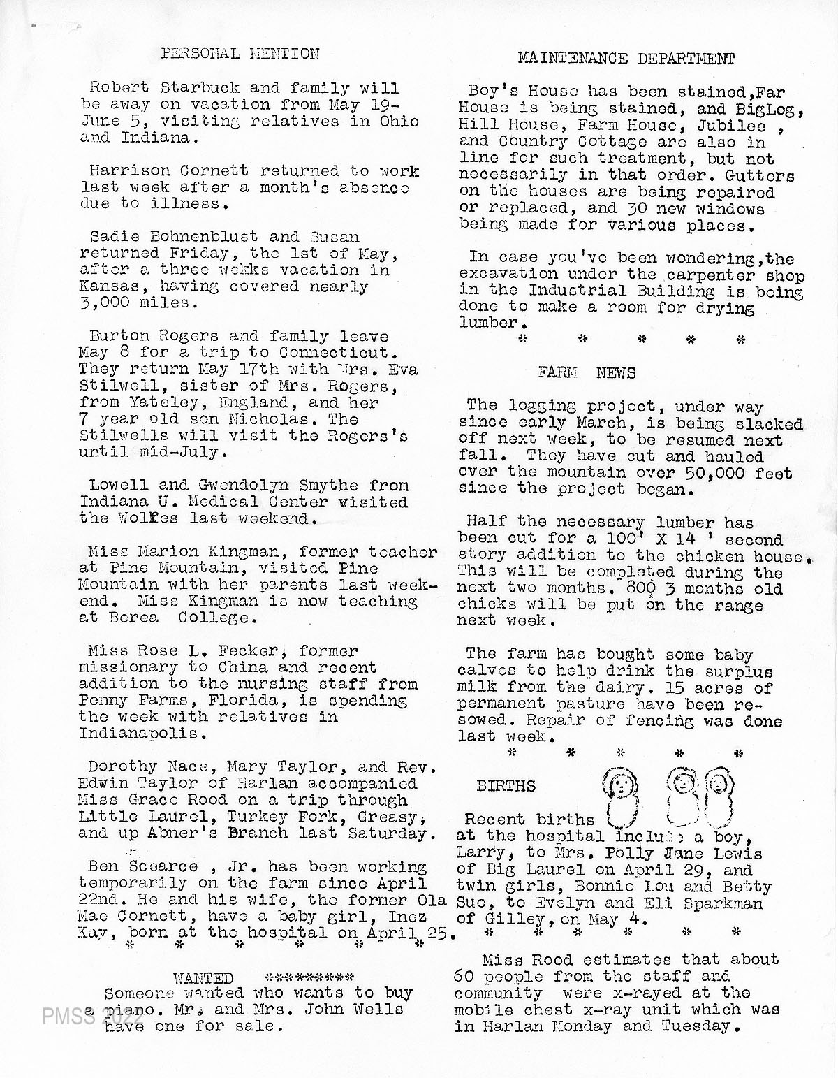 002 PERSONAL MENTION: News about Robert Starbuck and family; Harrison Cornett; Sadie Bohnenblust and Susan; Burton Rogers and family; Lowell and Gwendolyn Smythe (visitors); Miss Marian Kingman (former PMSS teacher); Rose L. Fecker (nurse); Dorothy Nace; Mary Taylor; Rev. Edwin Taylor; Ben Scearce, Jr. (temporary farm worker) and wife, Ola Mae (Cornett) Scearce.