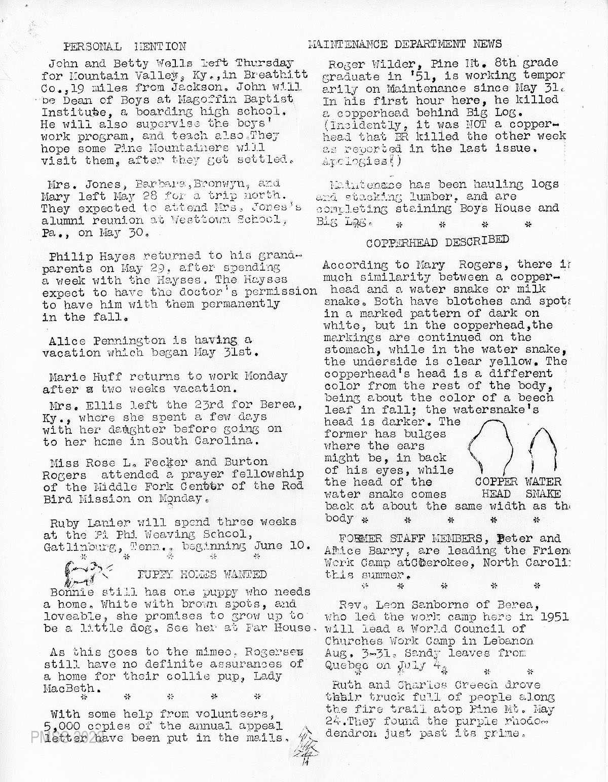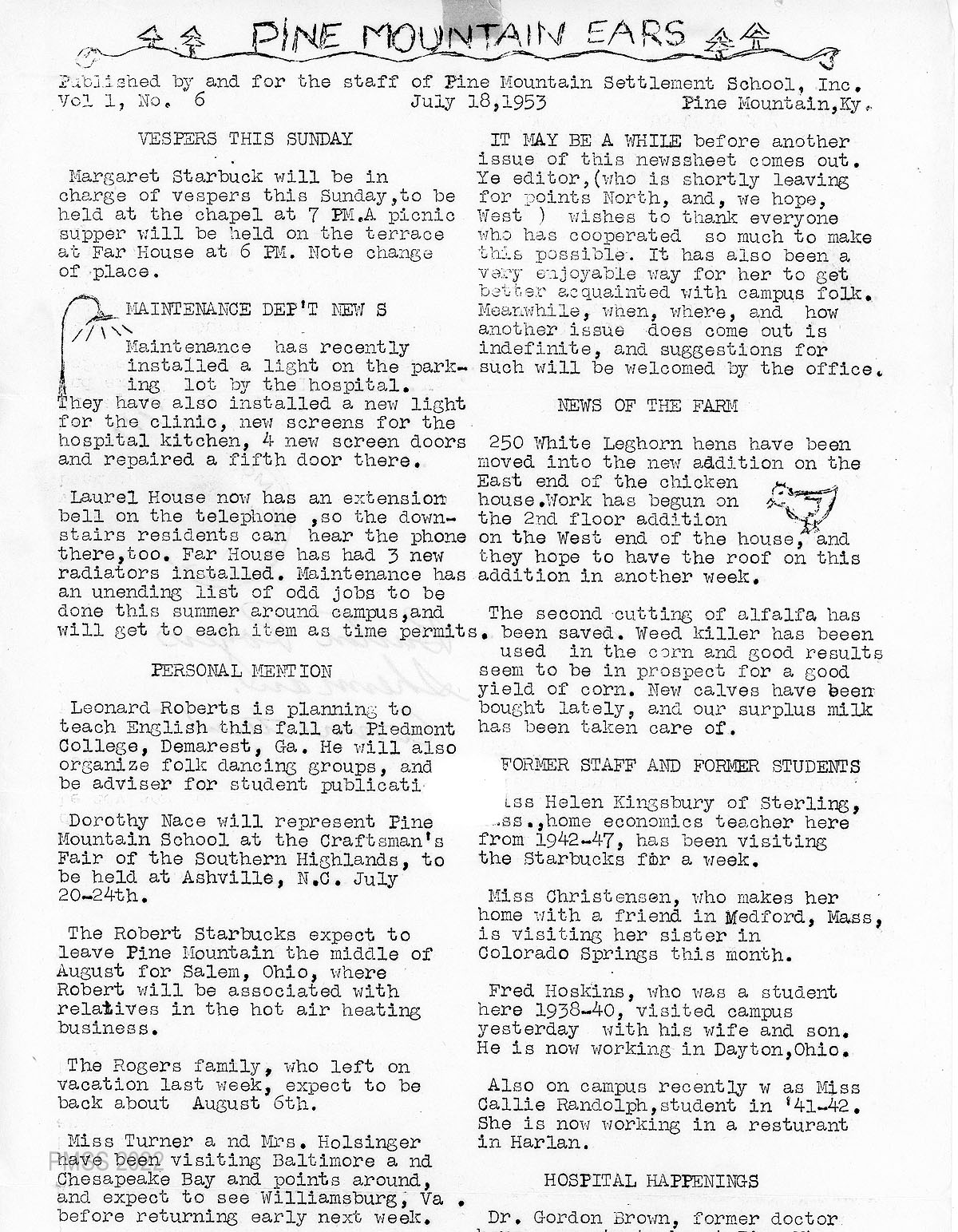 The Pine Mountain Settlement School informal staff newsletter, Pine Mountain Ears, was produced from 1949 until 1956 during the Community School years. It was edited by Dorothy Nace, a School staff member from 1949 until December 1952. Ellen [Gundersen] Wolfe served for several months as the Editor from May 8, 1953, until July 18, 1953.