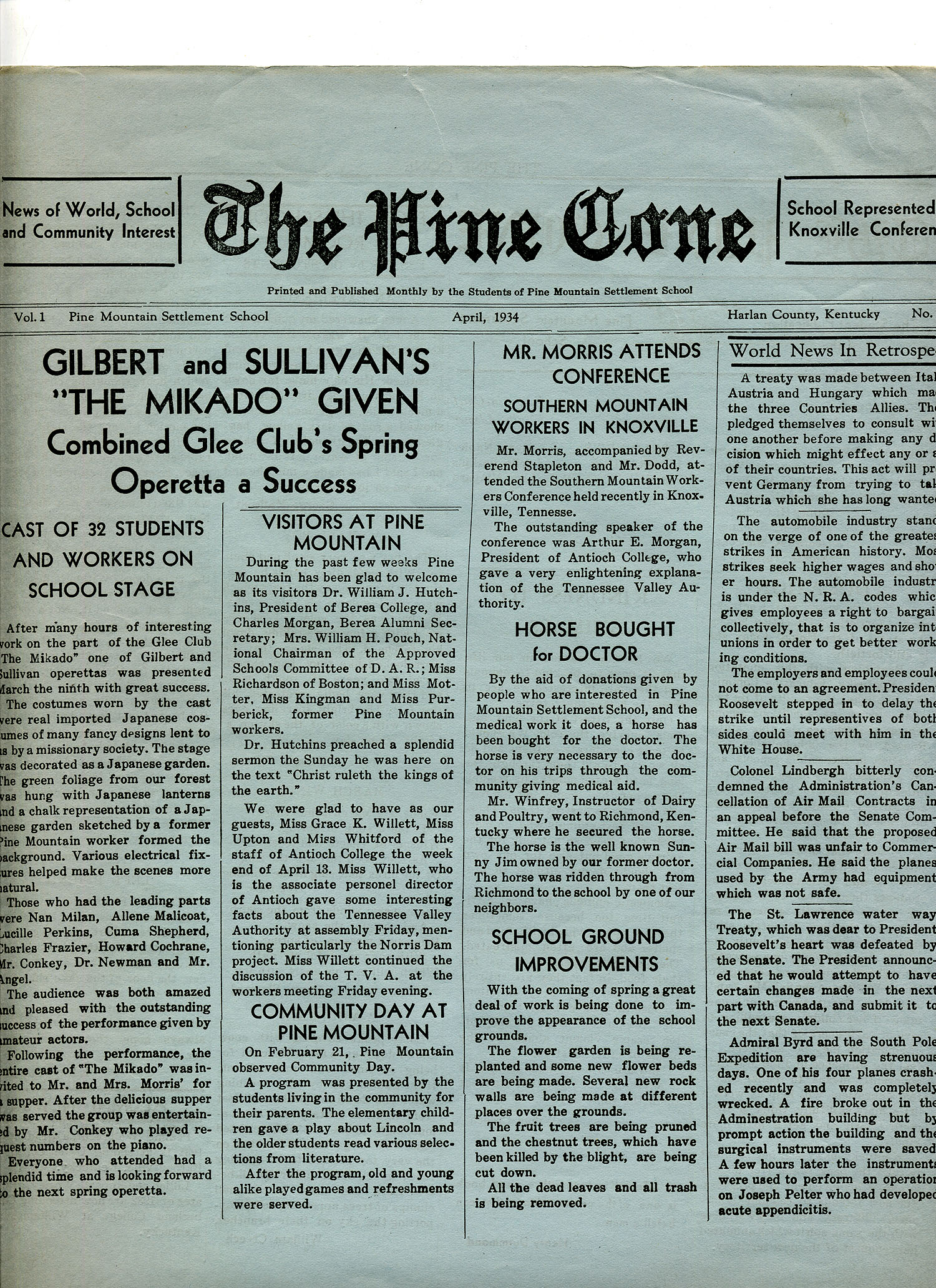 Gilbert and Sullivan’s The Mikado ; Glee Club ; Charles Morgan ; Mrs. William H. Pouch, National Chairman of the Approved Schools Committee of D.A.R. ; Miss Richardson ; Miss Motter ; Miss Kingman ; Miss Purberick ; William J. Hutchins ; Grace K. Willett ; Miss Upton ; Miss Whitford, Antioch College ; T.V.A. ; Community Day ; horses ; Mr. [Samuel] Winfrey ; dairy ; poultry ; Conference of Southern Mountain Workers ; Glyn Morris ; Arthur E. Morgan, President of Antioch College ; doctor’s horse ; flower garden ; rock walls ; fruit trees ; tree blight ; Roosevelt ; Air Mail dispute ; St. Lawrence Waterway Treaty ; automobile industry strike ; German threat ; Admiral Byrd ; South Pole