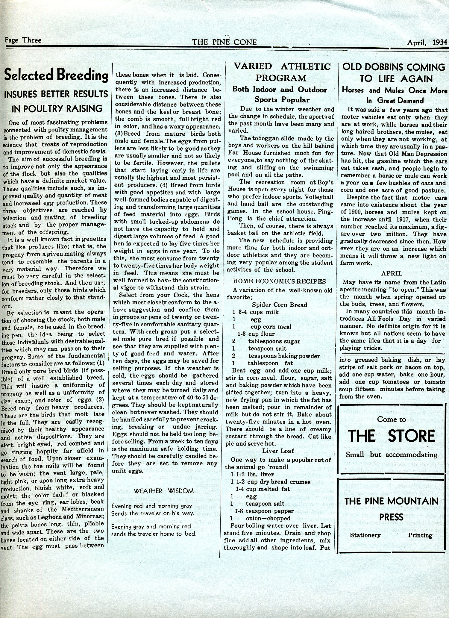 selected breeding ; poultry ; Home Economics ; recipes ; “Spider Corn Bread” ; sports ; “Liver Loaf” ; “Old Dobbins”