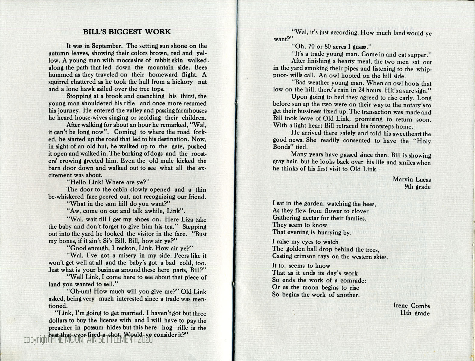 “The following poems, stories, and essays are the work of the students of Pine Mountain School, Pine Mountain, Harlan County, Kentucky,”