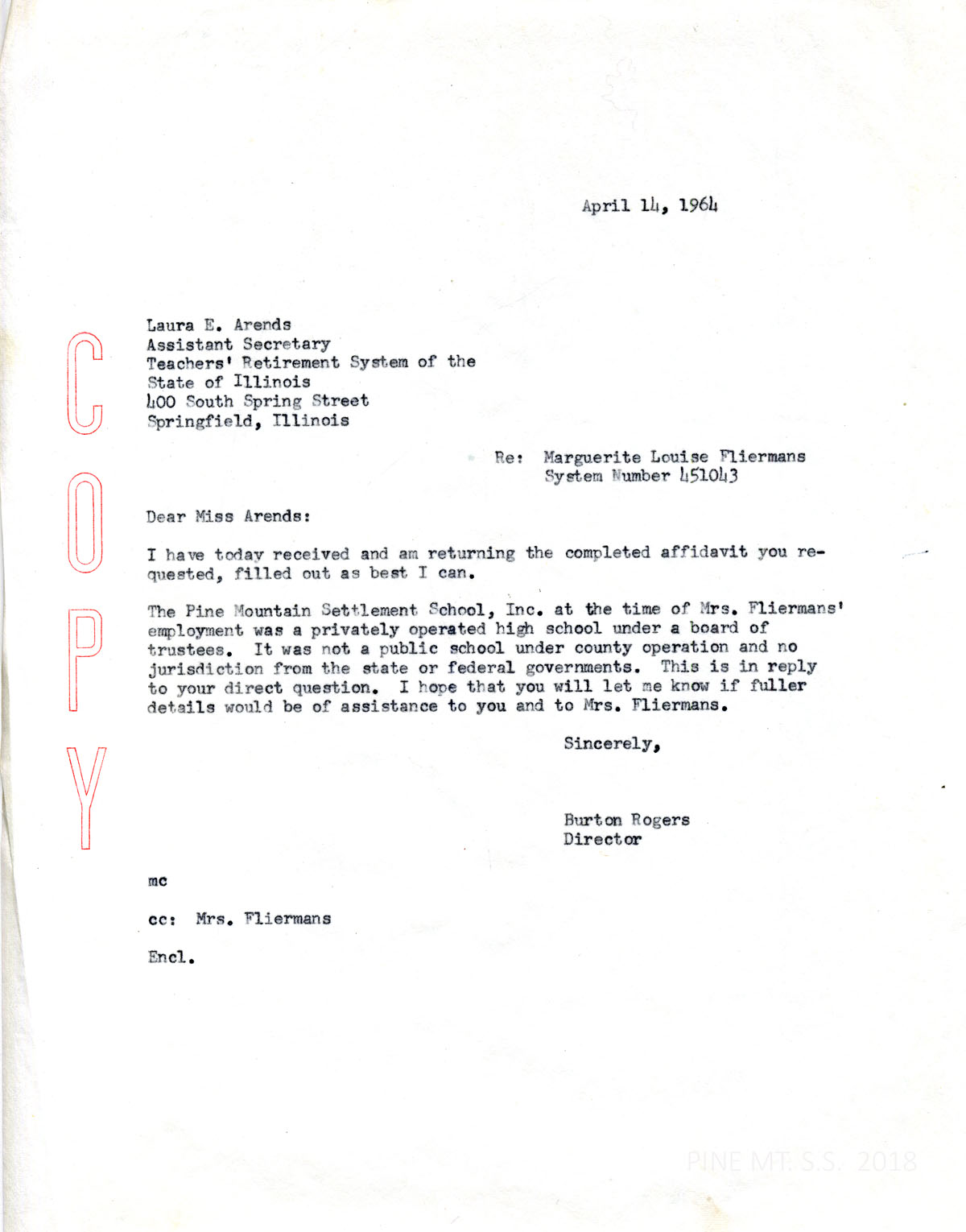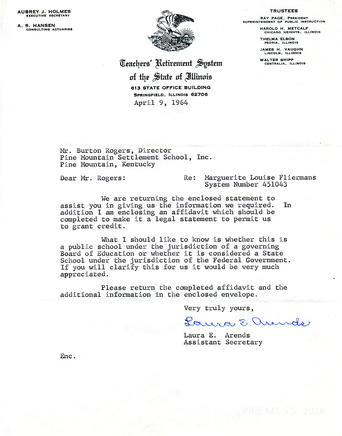 092 April 9, 1964. To Rogers from the Assistant Secretary from the Teachers’ Retirement System of the State of Illinois, Springfield, re: Marguerite Louise Fliermans. The secretary asks for additional information on his statement and encloses “an affidavit which should be completed to make it a legal statement to permit us to grant credit.”