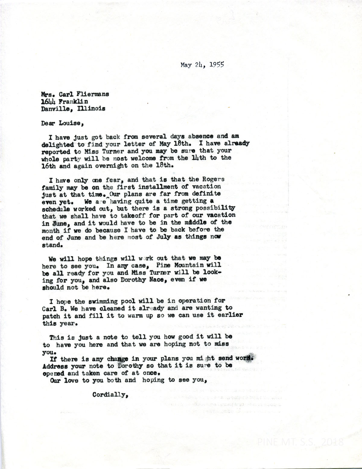 065 May 24, 1955. To Fliermans from [unsigned, apparently Rogers], welcoming her to PMSS but regrets that the Rogers may possibly be on vacation at that time. The swimming pool will be ready for Carl B.