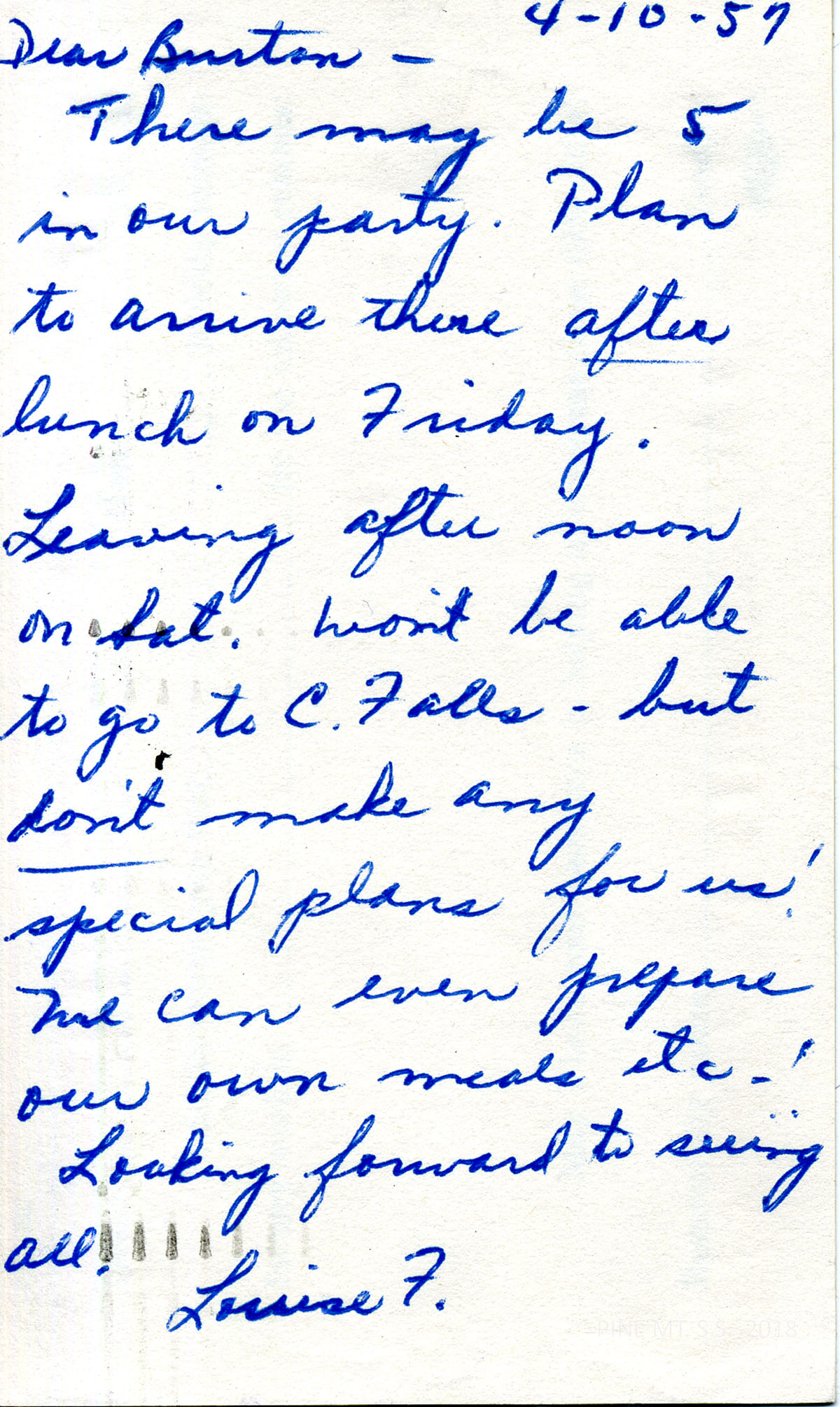 072a April 10, 1947. Message side of postcard to Rogers from Fliermans, with her travel plans; will bring five others.