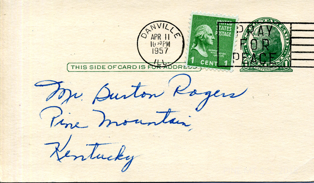 083 Address side of postcard to Rogers with date stamp: “October 5, 1959, Danville, Ill.”