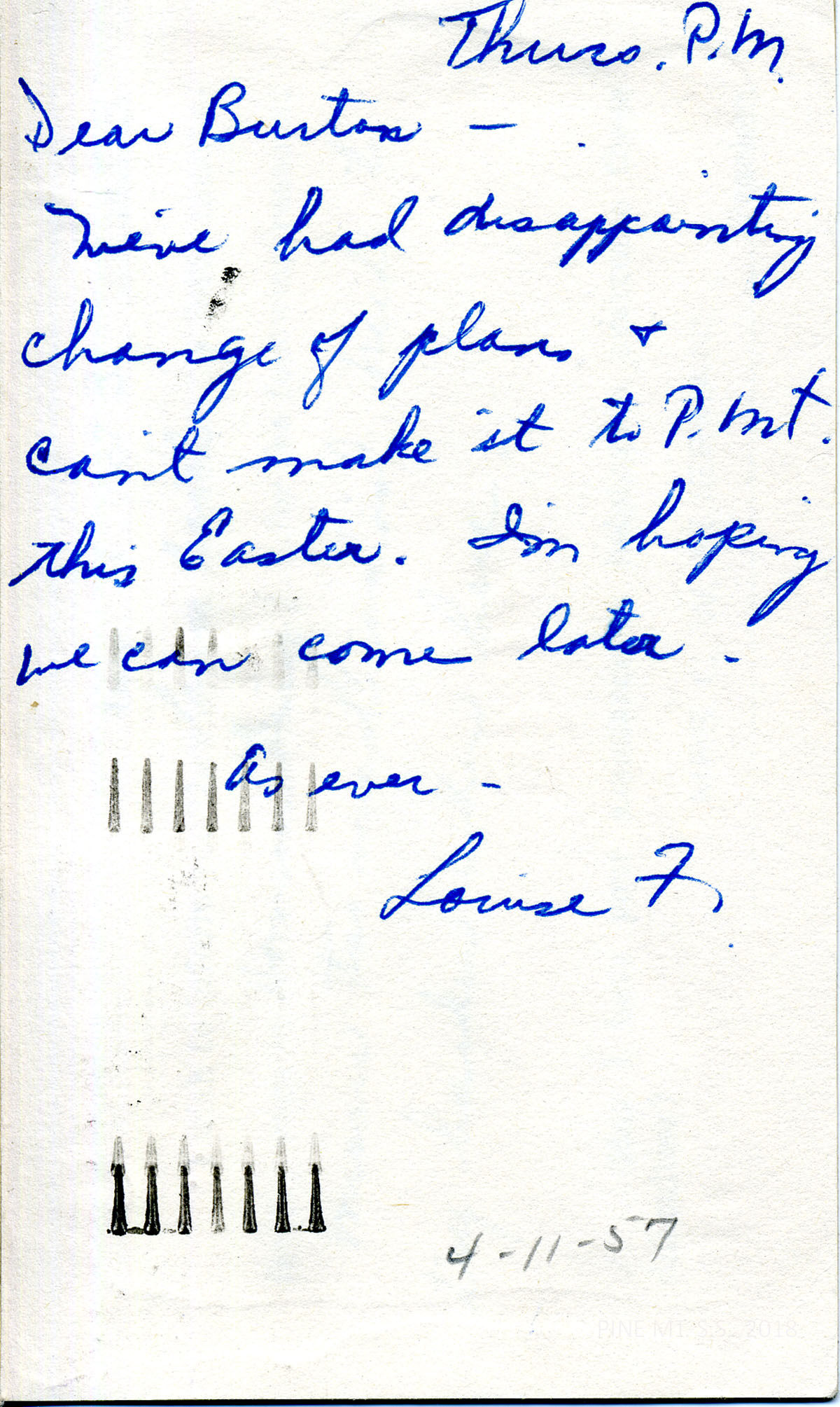 073a [Notation: “4-11-57”] Message side of postcard to Rogers. “We’ve had disappointing change of plans & can’t make it to P.Mt. this Easter.”