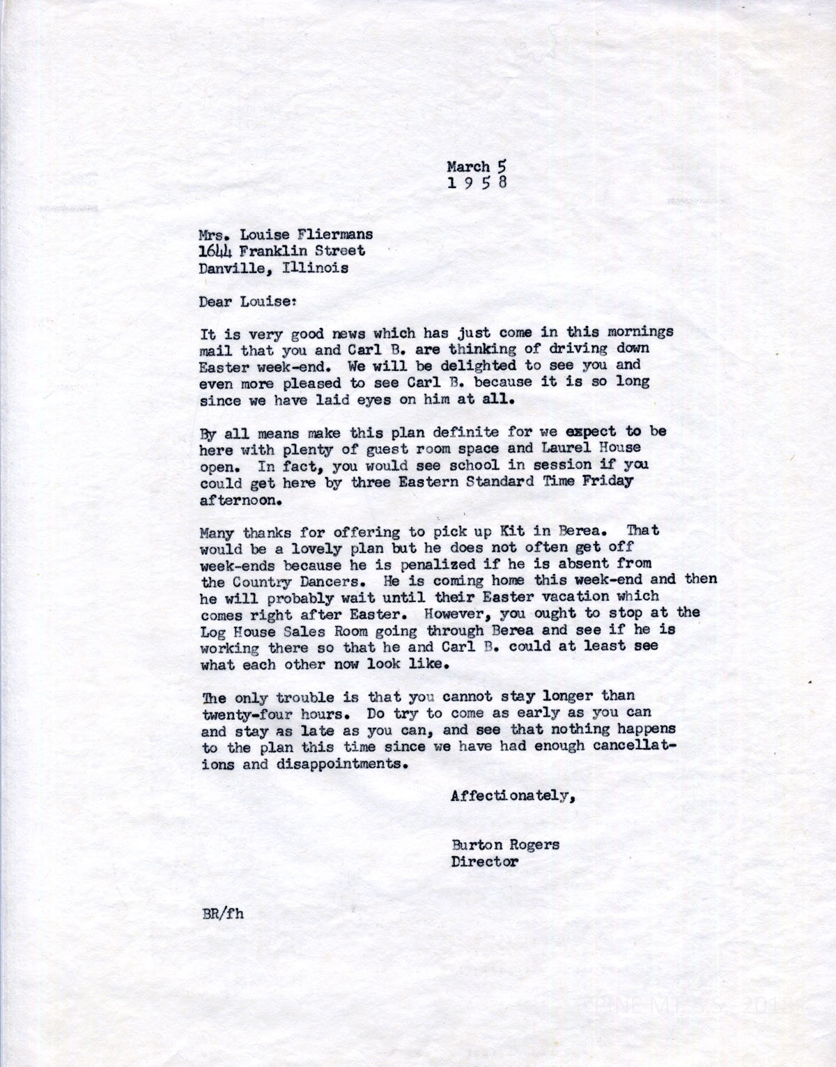 077 March 5, 1958. To Fliermans from Rogers, who welcomes her and Carl B. to PMSS for Easter; suggests that she stop at Berea College to see Kit Rogers.