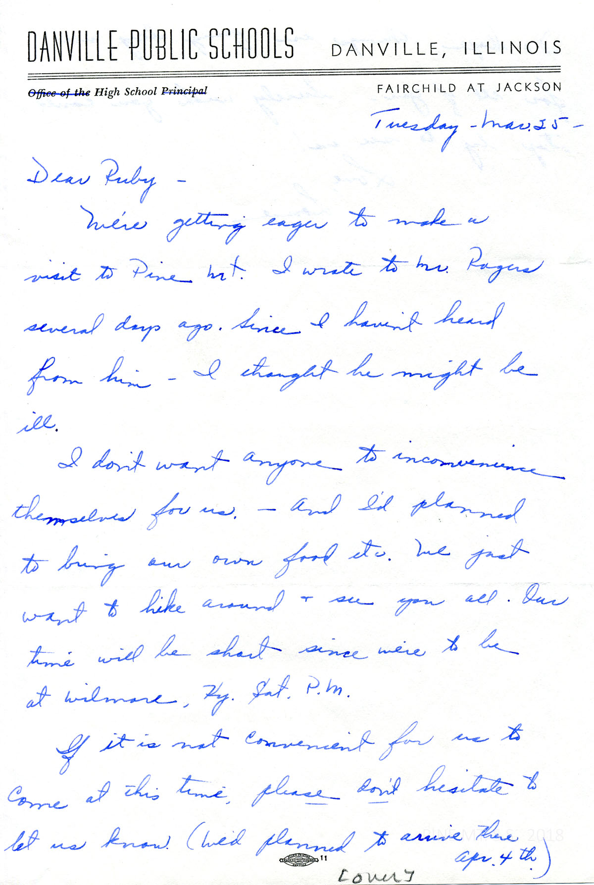 078-078a March 25, [no year]. Two-page letter to Ruby from Fliermans on “Danville Public Schools” letterhead, telling Ruby of her plans to visit PMSS and asking if it will be convenient or not.