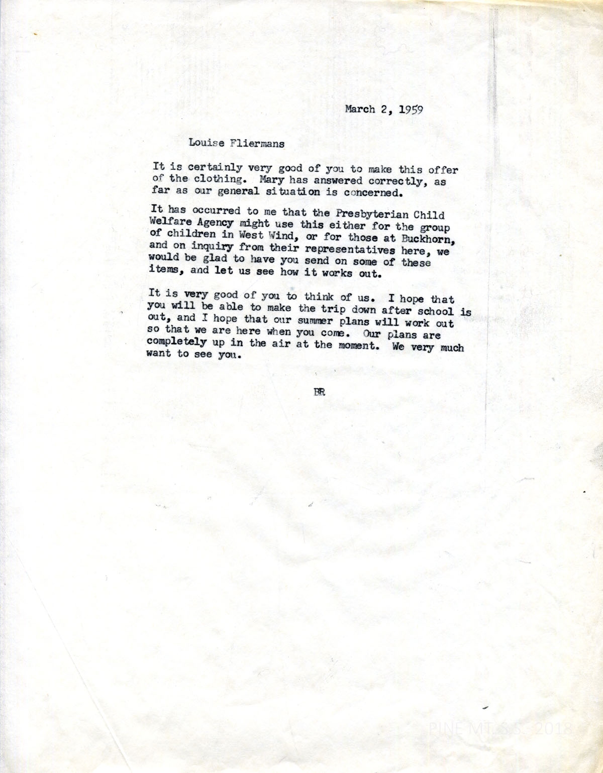 080 March 2, 1959. To Fliermans from “BR” [Burton Rogers]. “Mary has answered correctly, as far as our general situation is concerned.” However, the Presbyterian Child Welfare Agency may use a donation for the West Wind or Buckhorn children.