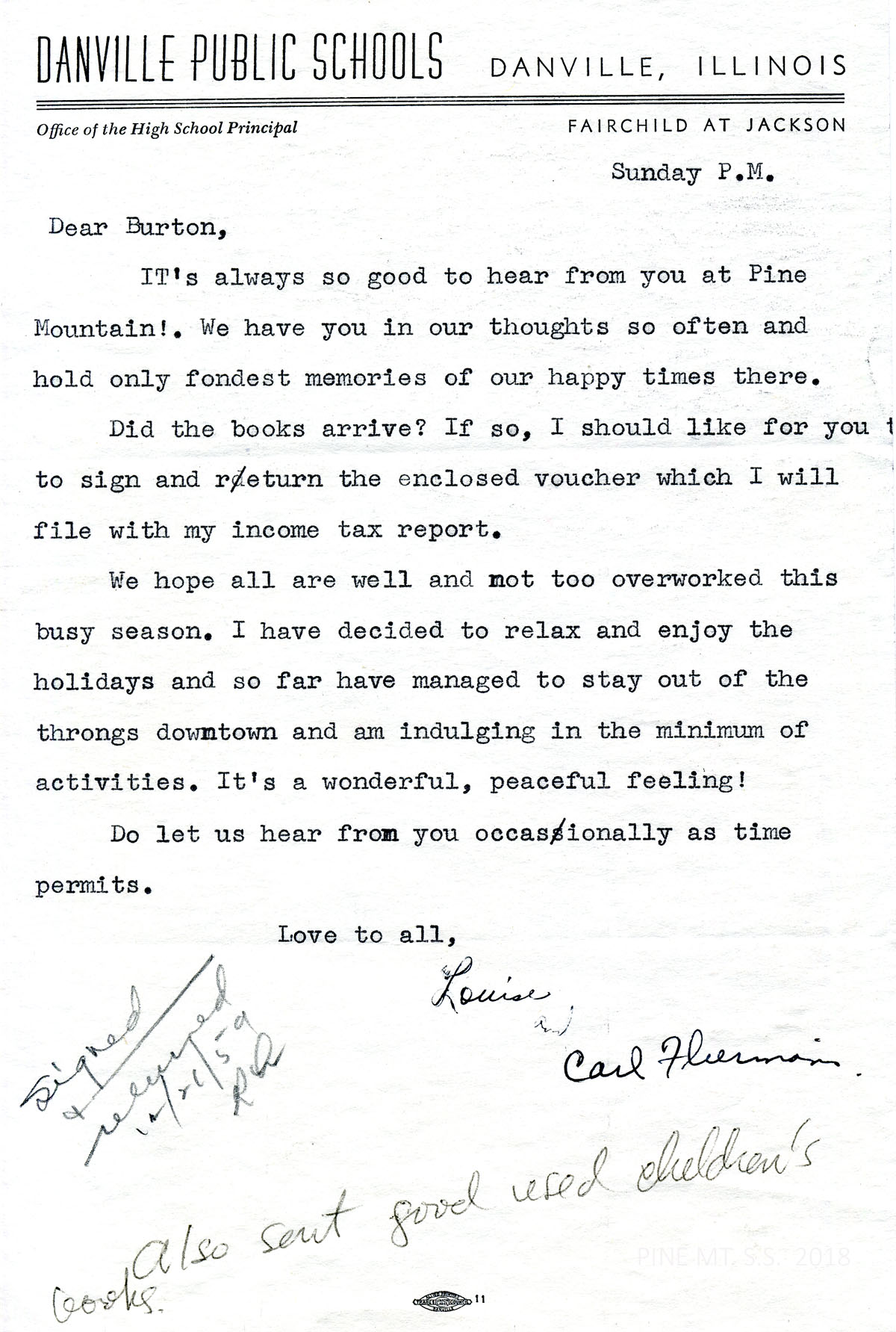 061 January 22, 1955. To Mrs. Louise Fliermans, Danville, IL, from PMSS Director Burton Rogers, who mentions that in Dorothy Nace’s absence, Fern Hayes is transcribing from the Dictaphone. He welcomes her to visit PMSS anytime at staff rates to rest or do PMSS work. Suggests she might keep the Rogers’ house when they are on vacation.