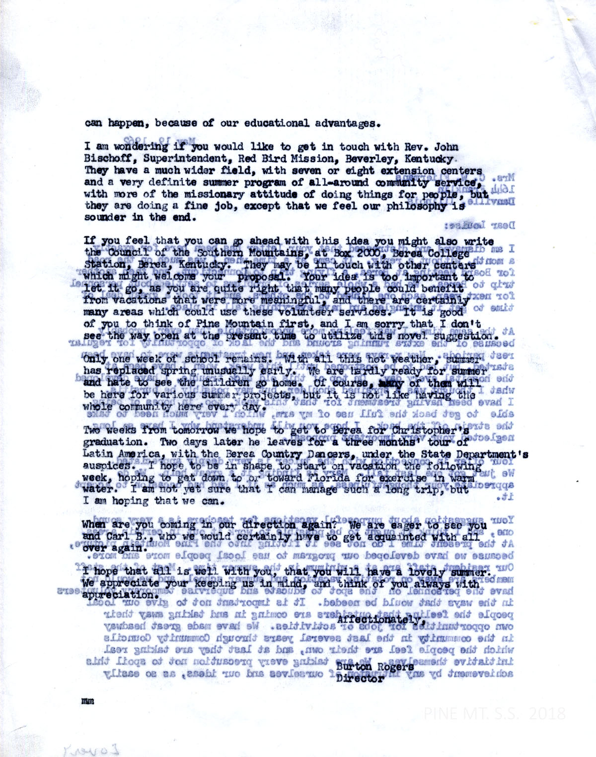 087-087a May 19, 1962. Two-page letter to Fliermans from Rogers, [087] stating reasons for the delay in responding; describes his health, including back trouble. He thanks her for offering a juicer but the School already has one. He appreciates her “suggestion about purposeful vacations for teachers,” but he feels it would not work at PMSS. He describes the progress the School is having with the community through Community Councils “which the people feel are their own, and at last they are taking real initiative themselves.” [087a] He suggests contacting Rev. John Bischoff, Superintendent, Red Bird Mission in Beverley, KY, or the Council of the Southern Mountains in Berea, KY, about her idea. Christopher Rogers graduates from Berea College in two weeks, then leaves with the Berea Country Dancers on a Latin American tour “under the State Department’s auspices.”