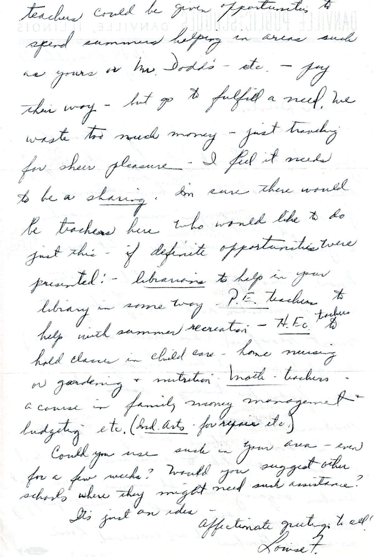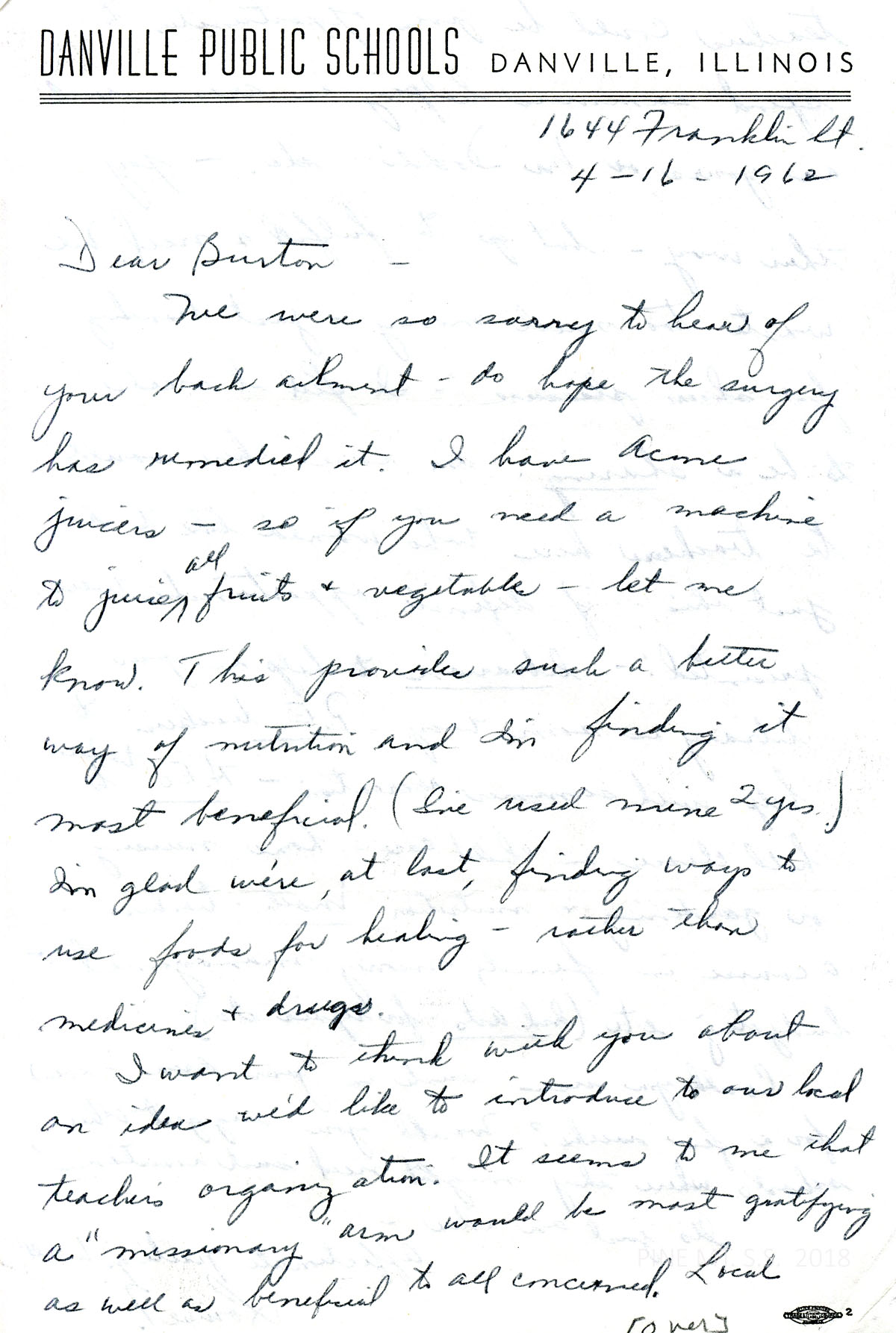 088-088a April 16, 1962. To Rogers from Fliermans on letterhead for “Danville Public Schools.” [088] She is sorry about his back ailment and surgery; offers to send Acme juicers. “I’m glad we’re, at last, finding ways to use foods for healing — rather than medicines & drugs.” She proposes the idea [088a] that “teachers could be given opportunities to spend summers helping in areas such as yours or Mr. [Arthur W.] Dodd’s…- pay their way – but go to fulfill a need.” She gives examples of teachers who could help.