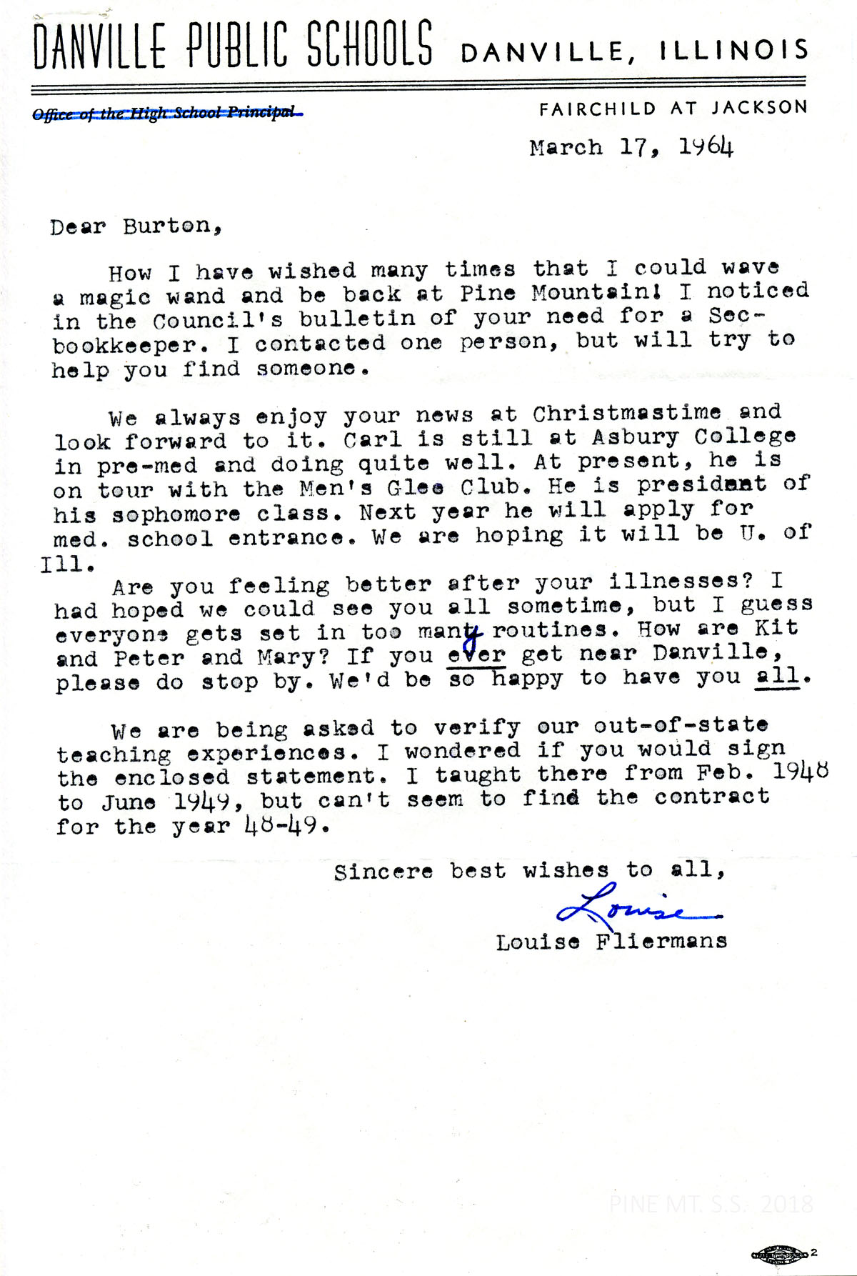 089 March 17, 1964. Typewritten letter to Rogers from Fliermans on letterhead for “Danville Public Schools.” “How I have wished many times that I could wave a magic wand and be back at Pine Mountain!” She will look for a suitable candidate for the secretary-bookkeeper opening. Carl is studying pre-med at Asbury College.