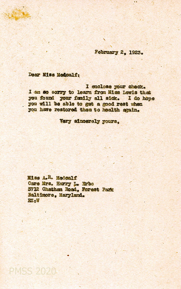 [Note: Letters from PMSS staff in the PMSS Collections are carbon copies, typewritten, unsigned, and meant for the Office files. The original signed documents were sent to the correspondents. The initials at the bottom left of most PMSS letters indicate the writer (along with initials of the secretary). For example, “KP” refers to Katherine Pettit, “EZ” to Ethel de Long Zande and “EKW” to Evelyn K. Wells. Letters from Anne Ruth Medcalf are handwritten originals unless specified otherwise. The following list of contents is in chronological order.]
