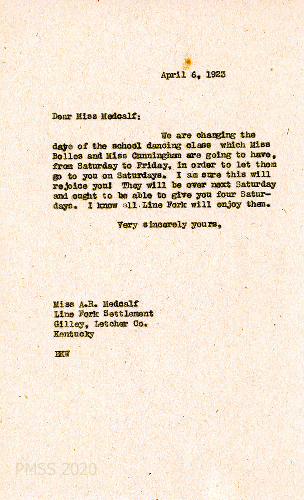 028 April 6, 1923. To Medcalf at Line Fork Settlement from EKW [Evelyn K. Wells, Secretary]. [Dorothy] and Miss Cunningham’s dancing class schedule was changed in order that they can visit Line Fork on Saturdays. “I know all Line Fork will enjoy them.”