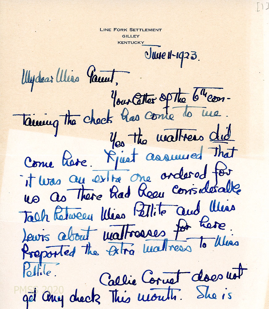 031 June 6, 1923. To Medcalf from [unsigned, apparently Miss [Bessie] Gaunt], enclosing a check for $10.50 for entertaining Line Fork visitors. Has a question about a mattress order and a check for “Callie.” Mentions Miss Whittaker.