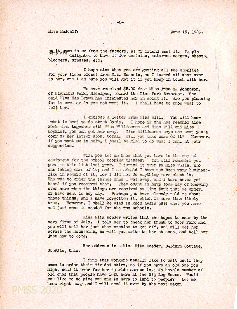 034-034b June 15, 1923. Three-page letter to Medcalf from [unsigned], [034] who is leaving at the last of June. Mentions preparations for the Fourth of July and the fair. Dr. Day is donating a radio; asks about what to order for “under the stoves before we have fires next Fall,” Cots, mattresses; barbed wire to keep out the hogs; [034a] donated material; linen closet supplies from Mrs. Rannels; $5 donation rom Miss Anna M. Johnston of Michigan for Line Fork bathroom; mentions Miss [Louise] Will, Corda, Miss Williamson, Miss Hopkins; asks if she received the equipment for the school cooking classes; Miss [Rita Rebecca] Roeder in Oberlin, OH, may visit; loaning “divided skirts…to ride across in.” [034b] Hopes Miss Smith will visit.