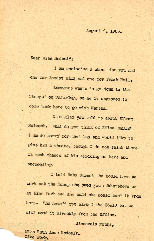 048 May 19, 1924. To Medcalf from KP [Pettit], who regrets not being able to “give work to your girls.” Miss [Ruth B.] Gaines has all the help she needs and “the rest of the houses get their work done by the few children who are staying to pay off their debt.” Thanks her for Mr. Baker’s letter. Suggests that she visits Mossie Miniard Baker, “one of our old girls who is married and living [at the mouth of Trace].”