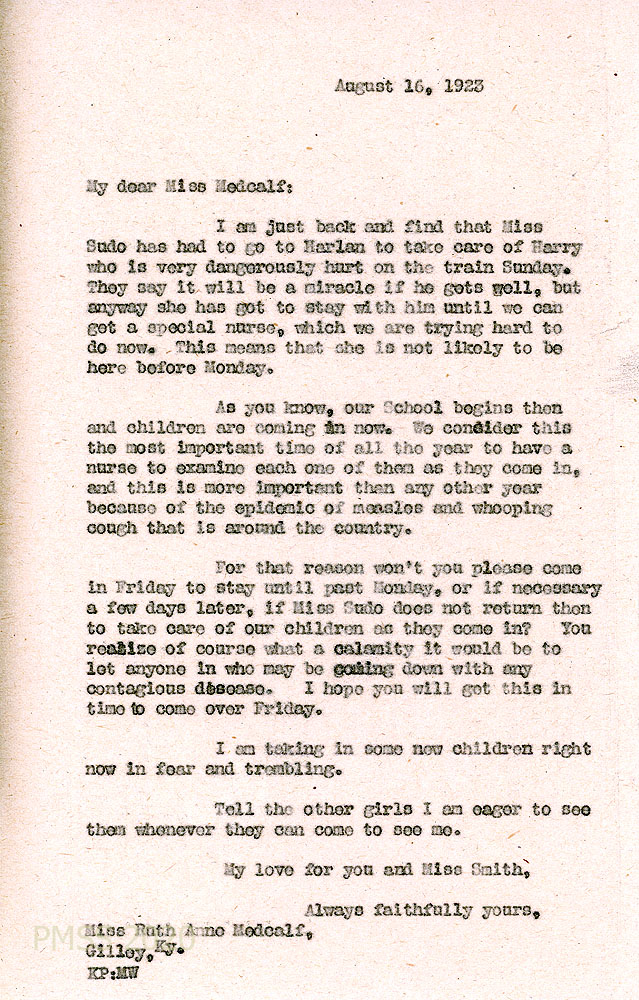 040 August 16, 1923. To Medcalf from KP [Pettit]. Explains Miss Sudo’s delay in returning. A nurse is needed at the beginning of School to examine each student, particularly during the current epidemic of measles and whooping cough. She asks Medcalf if she will come to PMSS for several days.