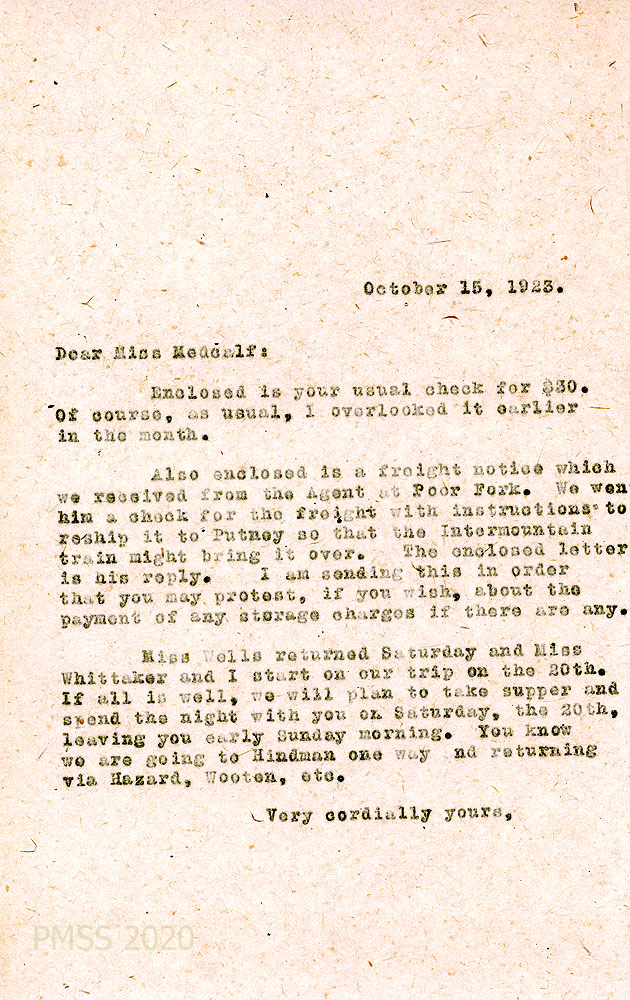 045 October 15, 1923. To Medcalf from [unsigned], enclosing a $30 check and a freight notice from the Poor Fork agent. Describes plans for a trip with Miss Whittaker.