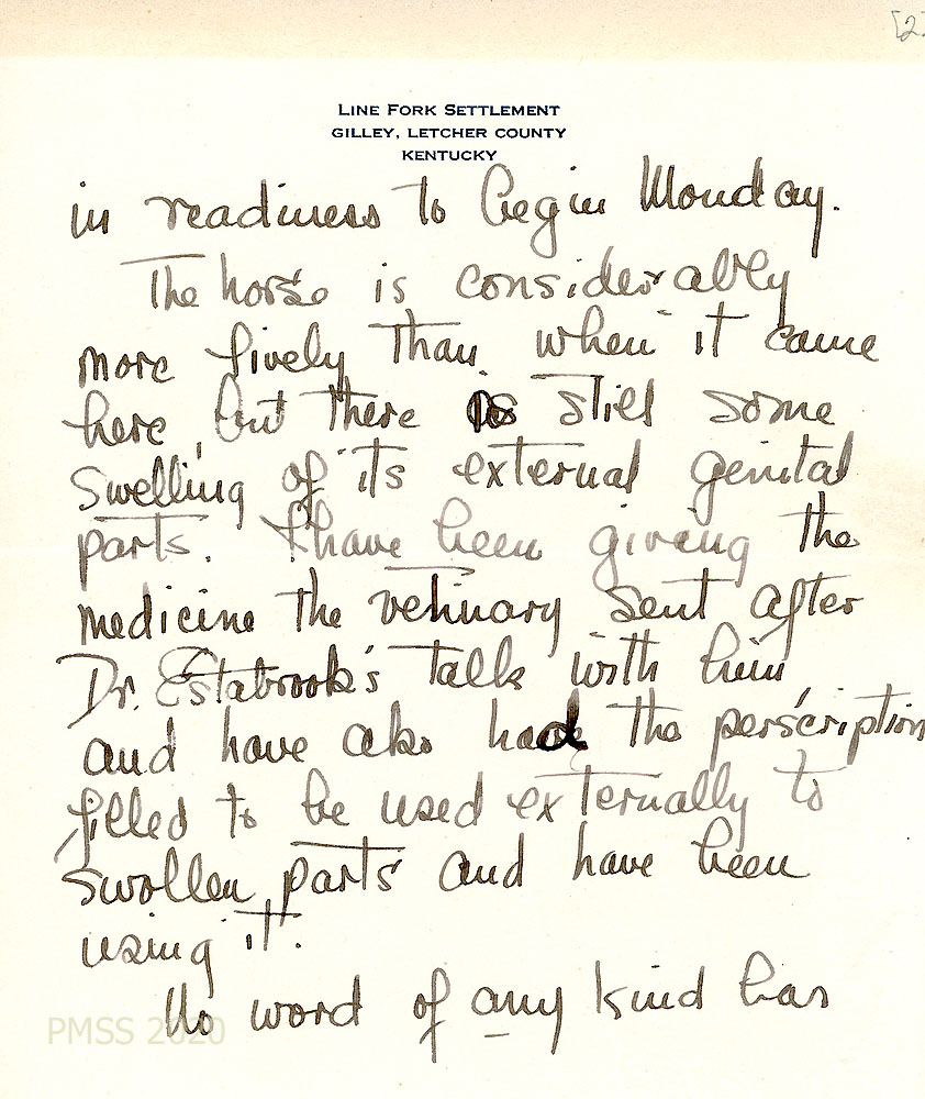 047-047c December 14, 1923. Four-page letter to Pettit from Medcalf on “Line Fork Settlement” stationary. [047] Explains why she hasn’t visited PMSS. Writes news about Bear Branch (now having hot lunches) & Coil Branch. [047a] Has concerns about the horse’s health; mentions Dr. Estabrook. [047b] The wire fence is finished. Mentions Mr. Browning [047c] who is taking children to Lynch for eye exams; assures that “all is well, or at least, things are going on as usual over here.” Mentions flag-raising at Bear Branch.