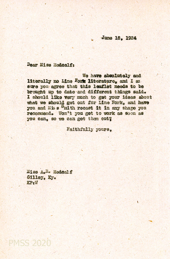 050 June 18, 1924. To Medcalf from KP [Pettit]. New Line Fork literature needs to be printed; asks Medcalf and Miss Smith for their input.