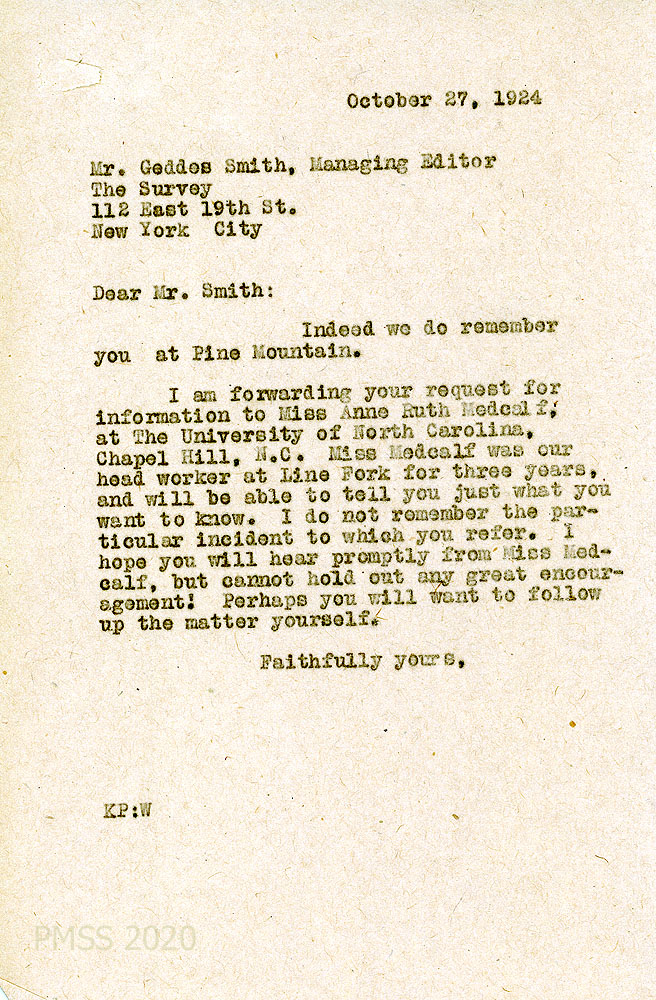 054 October 27, 1924. To Mr. Geddes Smith, Managing Editor, The Survey, NYC. from KP [Pettit], who is forwarding his letter to Medcalf at the University of North Carolina, Chapel Hill, NC. “Miss Medcalf was our head worker at Line Fork for three years….” Medcalf may be able to answer his questions about the “incident.”