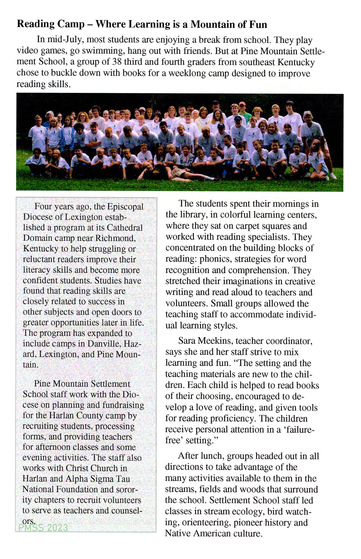 [Sidebar] Four years ago, the Episcopal Diocese of Lexington established a program at its Cathedral Domain camp near Richmond, Kentucky to help struggling or reluctant readers improve their literacy skills and become more confident students. Studies have found that reading skills are closely related to success in other subjects and open doors to greater opportunities later in life. The program has expanded to include camps in Danville, Hazard, Lexington, and Pine Mountain.