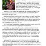 Nancy Adams highlights the growing concerns with the environment and the impact of humans on the environment. She thanks the many volunteers who contribute to the School’s programs: Kellie Phelan, Abby Mouser, Michael Carmack, Daisy Ray, Trail Conference Group ( Judy Burt, Dave McDonald, Chuck Rowlands, Bill Willis, Joe Burt, Duane Miksch, Jack Sautter, and Chuck Hogan). A special tribute is given to long-time employee, Matthew Boggs, a former PMSS student who was hired in 1951 and was still contributing his time to the School’s recreational programming in 2005.