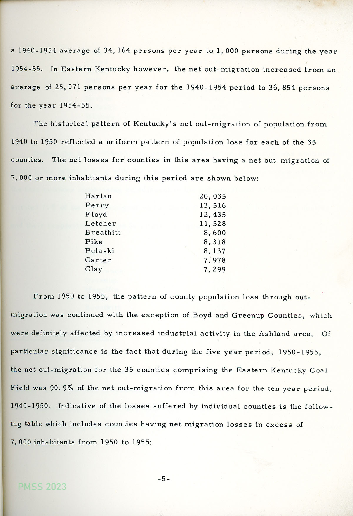 TAGS: Studies, surveys, reports, 1956, Eastern Kentucky coal field, coal mining, economic data, demographics, population shifts, economic activity, patterns of employment, wages, per capita income, bank deposits, Bureau of Business Research, U.S. Census Bureau, UK Department of Economic Security, UK Department of Rural Sociology, Federal Reserve Bank, population studies, rural sociology, population out-migration, economic activity