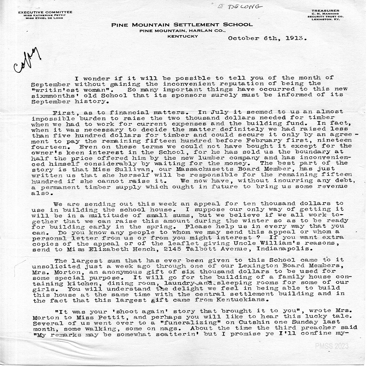 TAGS: Ethel de Long Zande, fundraising literature, Pine Mountain Settlement School promotion, promotional literature, advancement literature, writings, talks, literary production, first Laden Trail Road appeal
