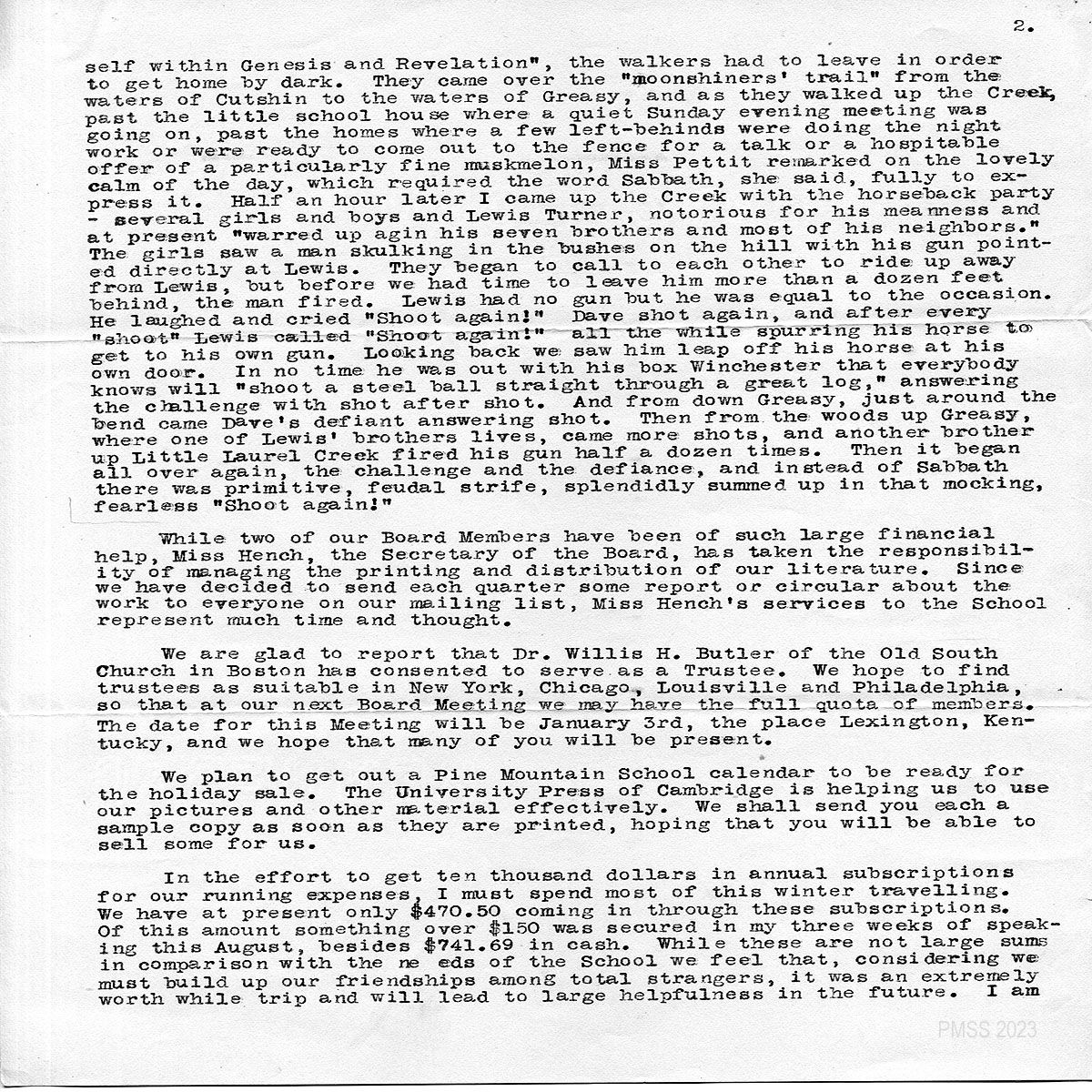 We have had also in the last week a meeting of our Local Advisory Board. We then determined to make a great effort to get a good graded road over Pine Mountain from the railroad so as to reduce our enormous hauling expenses, which now amount to seventy cents per hundred pounds. A dozen citizens plan to appear before the fiscal court in Harlan Town next Tuesday to petition for funds for this purpose and they have asked me to make a speech, presenting the case for the School. We decided also to try to secure everyone’s co-operation in getting our land in order as…
