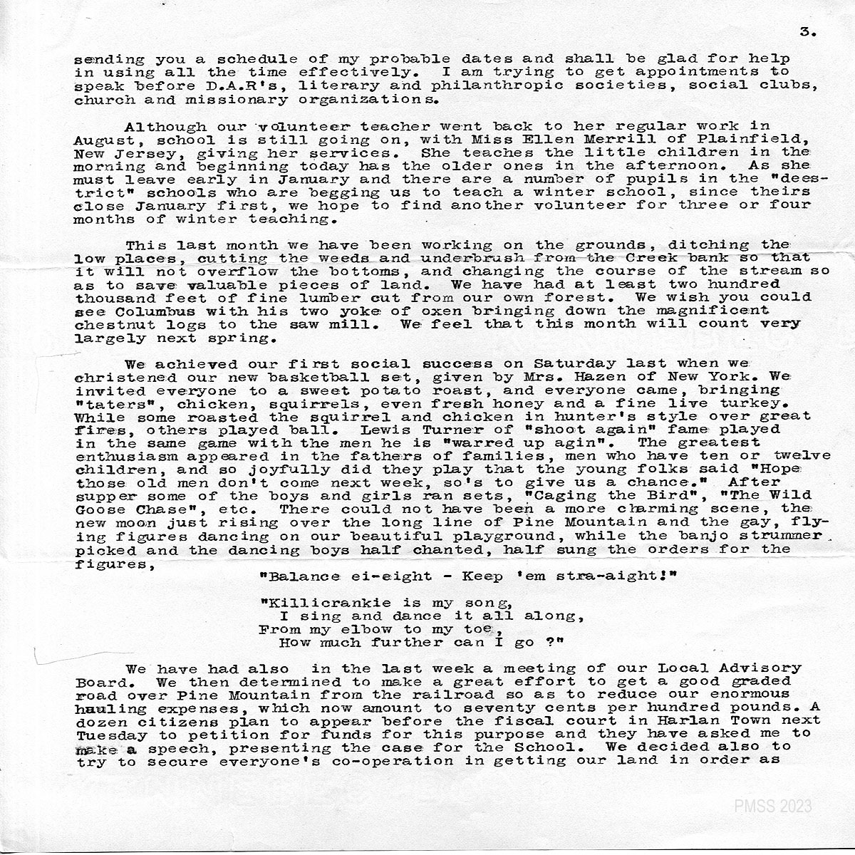 We achieved our first social success on Saturday last when we christened our new basketball set, given by Mrs. [George] Hazen of New York. We invited everyone to a sweet potato roast, and everyone came, bringing “taters”, chicken, squirrels, even fresh honey and a fine live turkey. While some roasted the squirrel and chicken in hunter’s style over great fires, others played ball. Lewis Turner of “shoot again” fame played in the same game with the men he is “warred up agin”. The greatest enthusiasm appeared in the fathers of families, men who have ten or twelve children, and so joyfully did they play that the young folks said “Hope those old men don’t come next week, so’s to give us a chance.” After supper some of the boys and girls ran sets, “Caging the Bird”, “The Wild Goose Chase”, etc. There could not have been a more charming scene, the new moon just rising over the long line of Pine Mountain and the gay, flying figures dancing on our beautiful playground, while the banjo strummer picked and the dancing boys half chanted, half sung the orders for the figures,