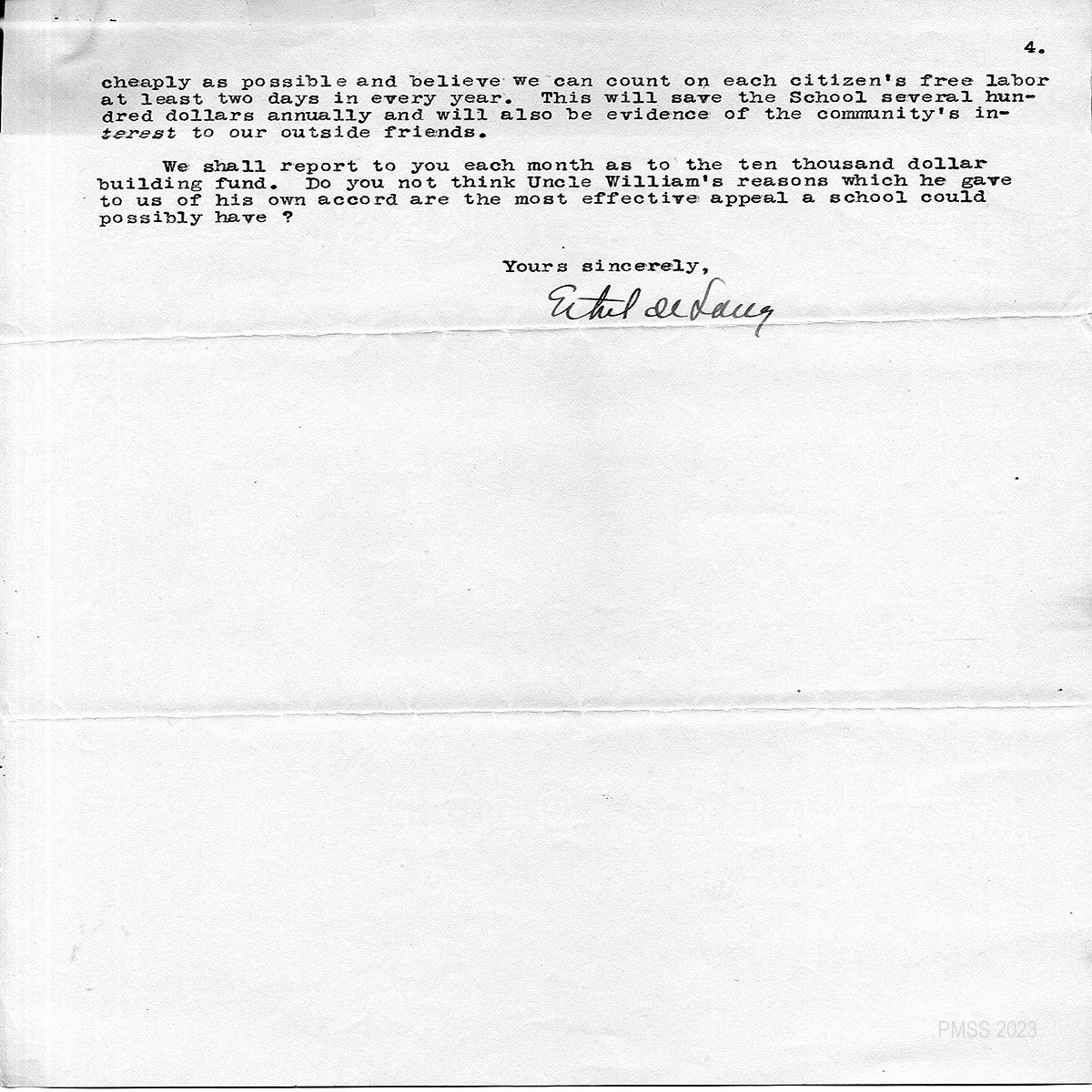 …cheaply as possible and believe we can count on each citizen’s free labor at least two days in every year. This will save the School several hundred dollars annually and will also be evidence of the community’s interest to our outside friends.