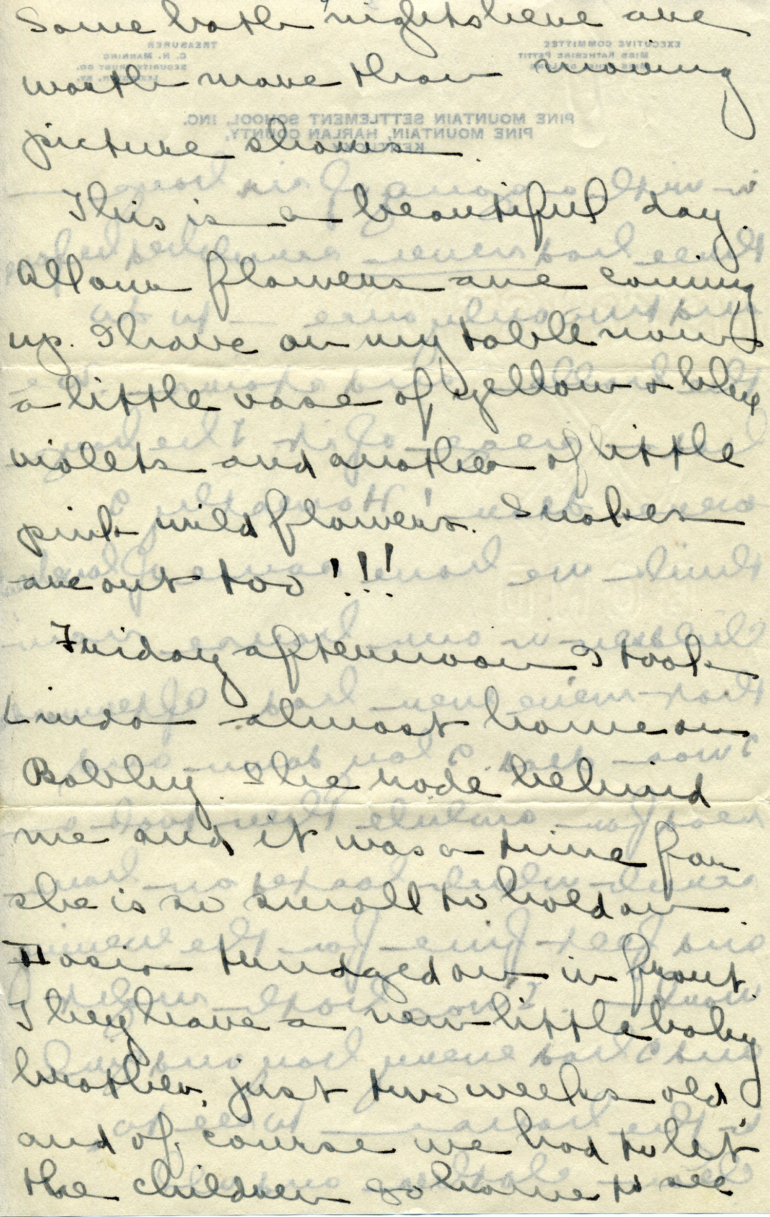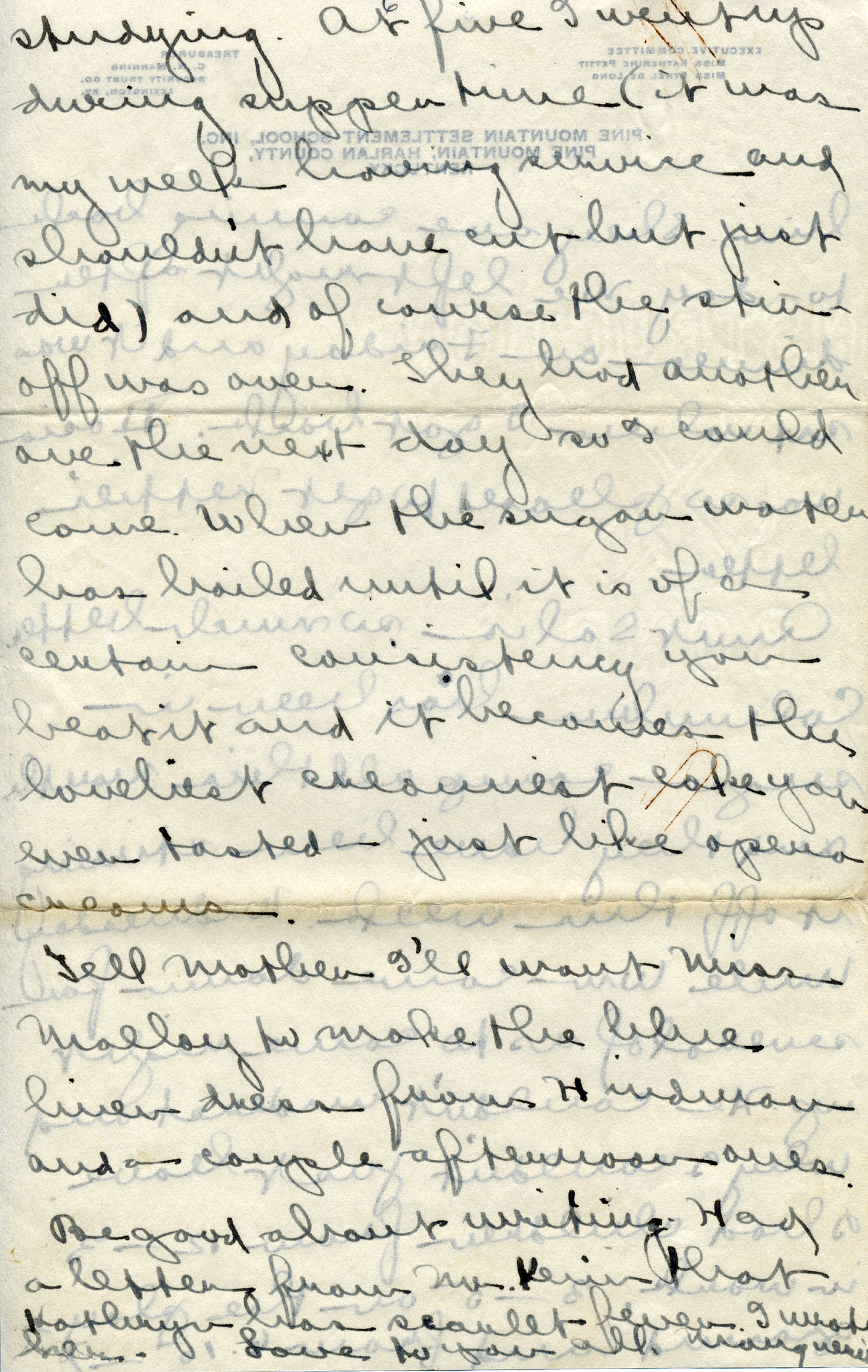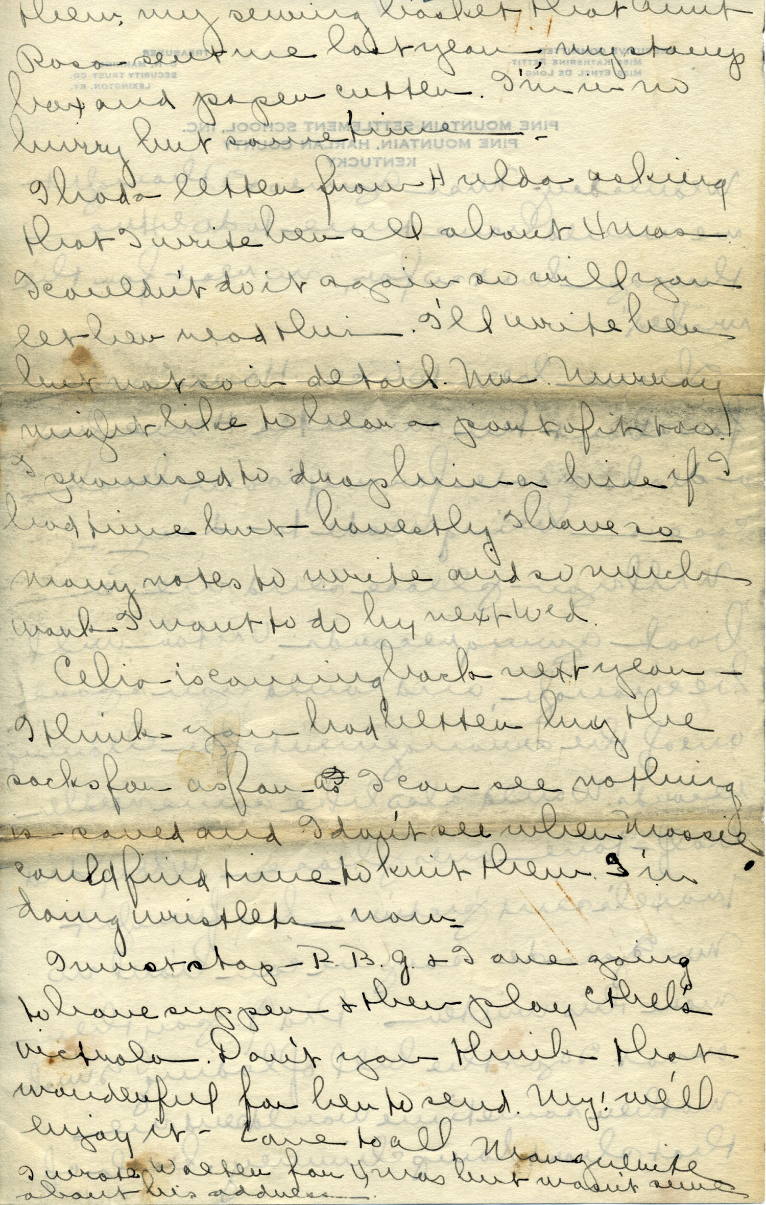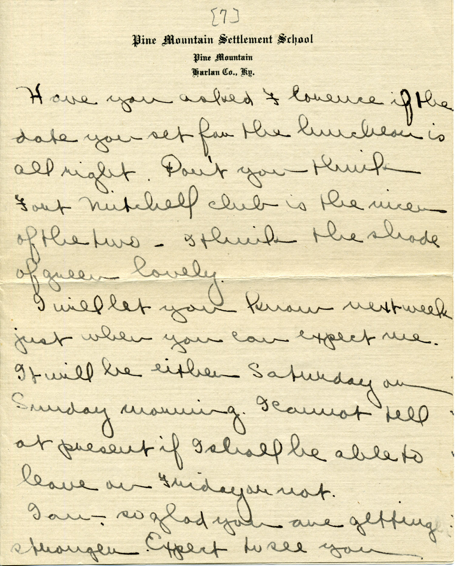 Dear Jeannette — It is just nine thirty and every bit of the housework is done. The children are all out playing for about a half hour until it’s time for Sunday School, so unless K. P. [Katherine Pettit] comes I’m good for a little while. I wonder if Celia called you up. She sent me a box of Mullove’s candy with a note “I wish you were here!” Even Uncle William thought she might have gone to some other place besides Cincinnati. He didn’t think it was quite right. Miss Gaines and I are to leave Thursday morning, reaching Cumberland Gap about six that night. Celia joins us there about noon on Friday. I haven’t been across Pine Mt. since January 4th so am looking forward to the trip. We’ll be back Sunday. Mrs. Light [Mrs. Ella Sue Light, housemother] is taking my children in school for two days and I guess K. P. will have to take the house.