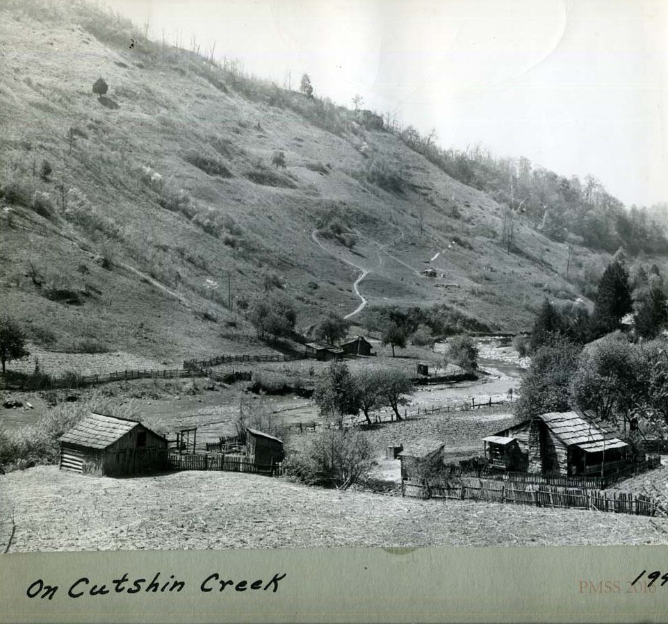 “On Cutshin Creek 1948.” Distant view of cabins, creek, hillside.[nace_II_album_022.jpg] [Photo not part of original Giffin research]