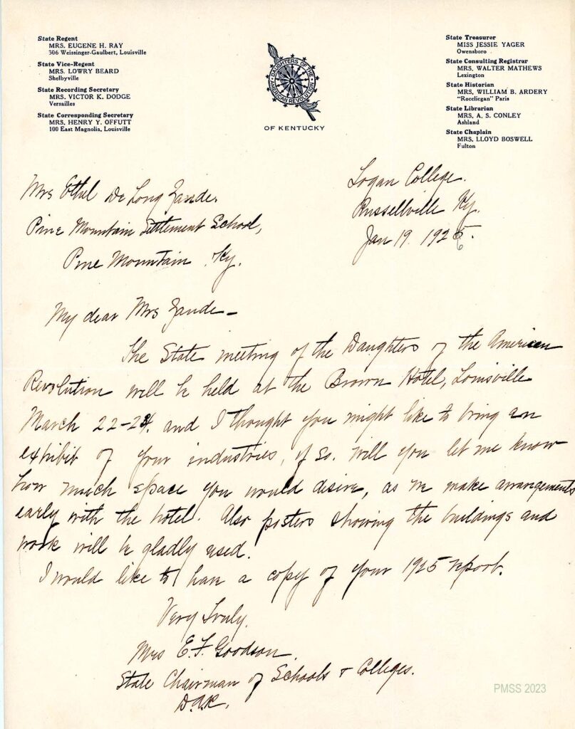 By the 1940s the following letters from Pine Mountain Director H.R.S. Benjamin to the organization, reflect the ambivalence of the Pine Mountain Settlement School to associate directly with the exclusive organization or to be constrained by its exclusionary student scholarship program. While early Pine Mountain was an active member of the organization and benefited from its philanthropy, the later years moved away from the organization. Generally, Pine Mountain showed their reluctance to accept scholarships for specific students from the organization, preferring instead to accept donations to fund their general School programs for all their students and not the chosen few. Following the departure of PMSS Director Katherine Pettit, the Pine Mountain Settlement School correspondence reveals a growing tendency to avoid any compromising affiliation with the D.A.R., but always remaining cordial and careful to find ways to work with the D.A.R. organization.