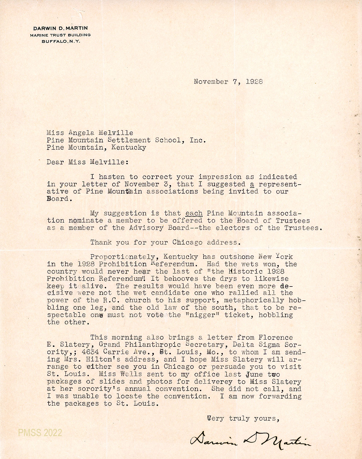 100 November 7, 1928. To Melville from Martin, clarifying his suggestion about representatives “of Pine Mountain associations being invited to our Board.” He states his opinion concerning the 1928 Prohibition Referendum. He is sending Melville a letter from Florence E. Slatery, Grand Philanthropic Secretary, Delta Sigma Sorority in St. Louis MO, hoping Melville and Slatery can arrange a meeting. He is sending a Miss Well’s package of slides and photos to Slatery.