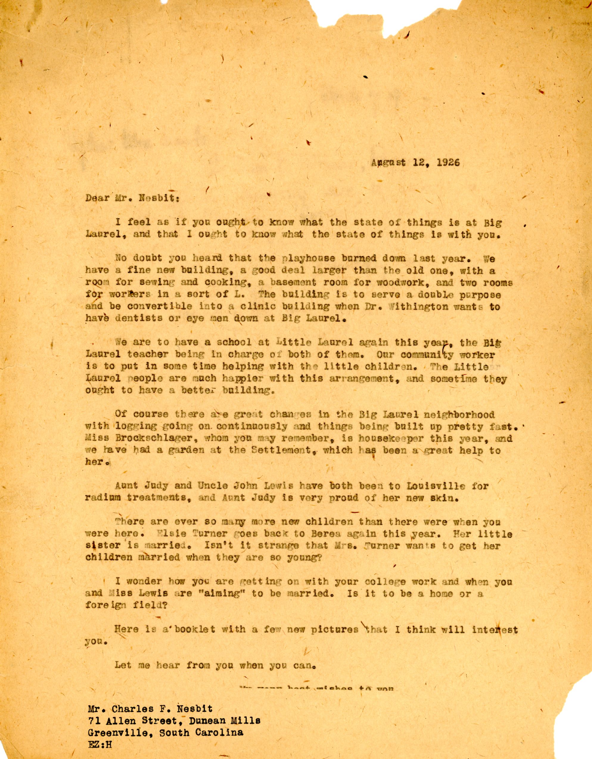 006 August 12, 1926. To Charles F. Nesbitt, Greenville, SC, from [last line(s) are truncated], updating him on “Big Laurel” [Big Laurel Medical Settlement]. The writer tells of the burning of the playhouse last year which was replaced by a new building, which she describes such as, a plan for a Little Laurel school this year, and who will manage it; changes brought about by logging; Miss [Anna] Brockschlager is housekeeper this year; radium treatments for Aunt Judy and Uncle John Lewis; increase in the number of school children; return of Elsie Turner to Berea College. The writer then asks how Nesbit is “getting on with…college work and when you and Miss Lewis are…to be married.”