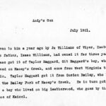 ” Given to him a year ago by Joe Williams of Viper, KY.. his father., Isaac Williams, had owned it for three years.. Isaac got it of Taylor Maggard, Git Maggard’s boy, who lived on Macy’s Creek, and come from West Virginia to Cutshin.. Taylor Maggard got it from Gordon Bailey, who lived on the Bailey Fork at Macey’s Creek. He in turn got it of a boy who lived on Big Leatherwood., who goes by the name of Kaisel.”