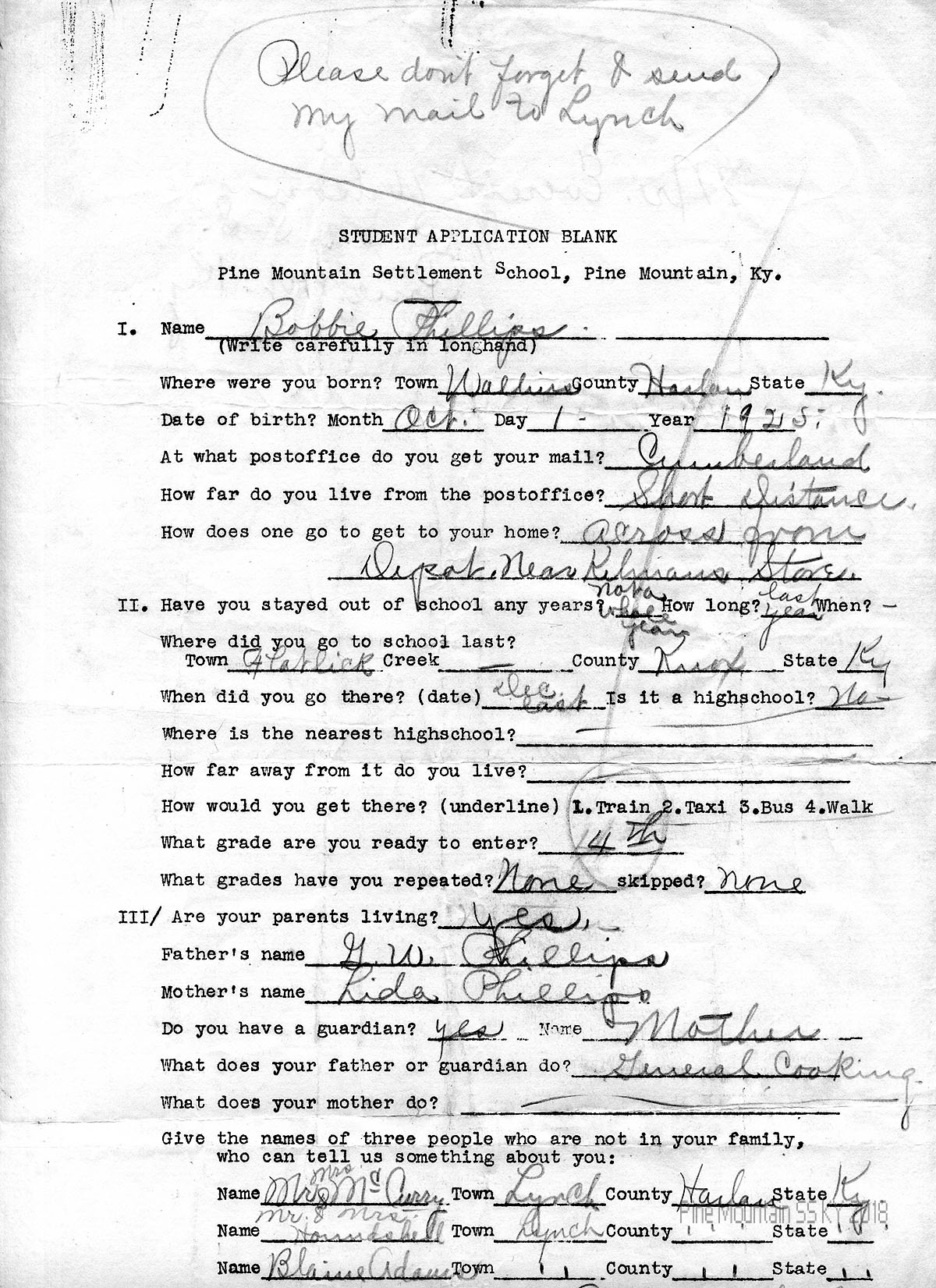 ….Why do you want to come to Pine Mountain? To be in school regular[ly] and we know and are so well acquainted with rules & regulations. [Notation in top margin: “Please don’t forget I send my mail to Lynch.” Notation in bottom margin: “Application filled out by Bobbie’s mother.”]