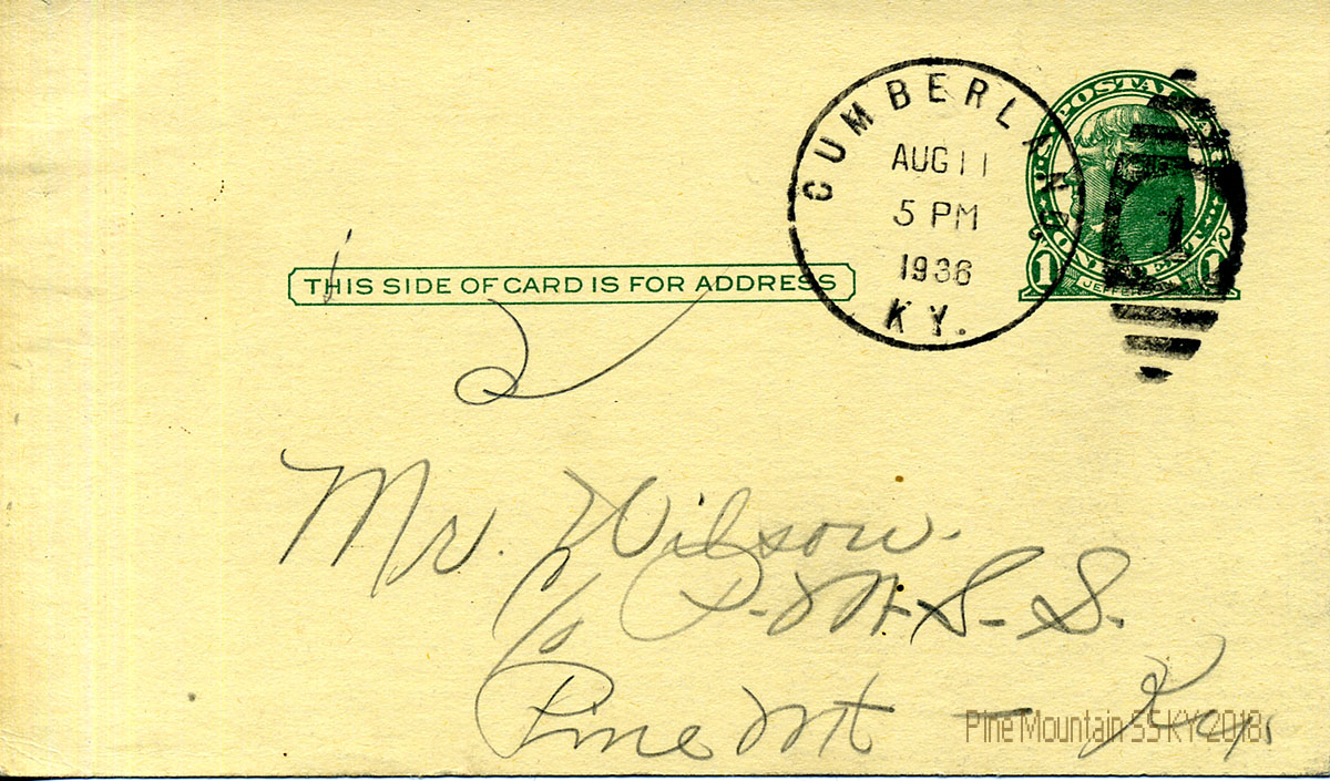 009 Postmark on the address side of a postcard: “Aug 11, 1938, Cumberland, Ky.,” addressed to “Mr. Wilson, ℅ P.M.S.S., Pine Mt. Ky