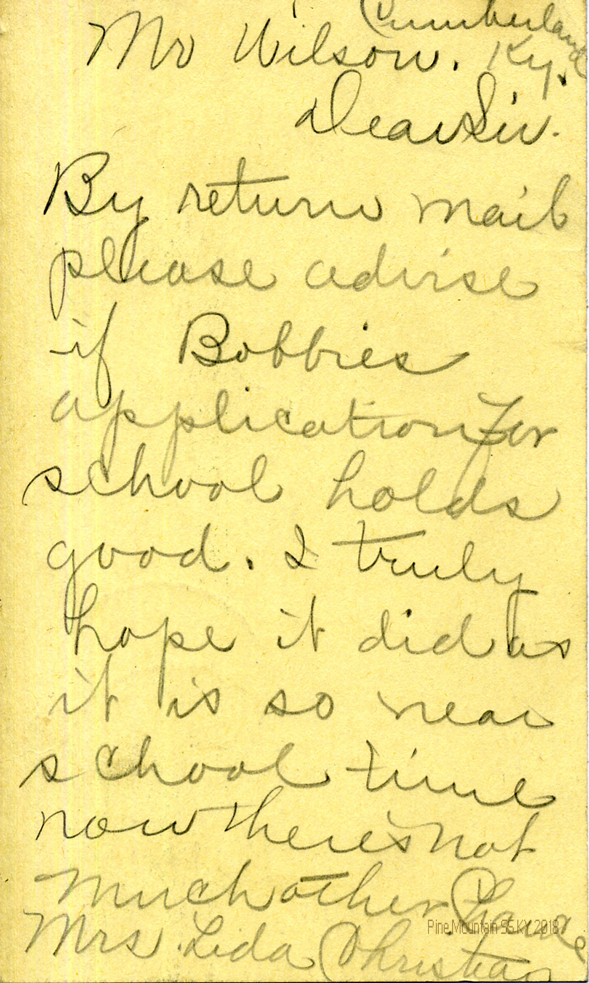 009a N.D. Handwritten note on a postcard to Mr. Wilson from Mrs. Lida Christian, asking “if Bobbie’s application for school holds good.”