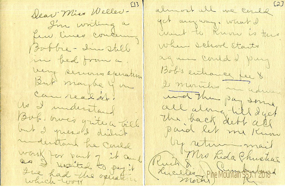011 N.D. Handwritten letter to Miss Weller from Mrs. Lida Christian, “Ruth, & Lucille’s Mother,” concerning Bobbie’s school bill and how she can pay it. She is recovering “from a very serious operation.”